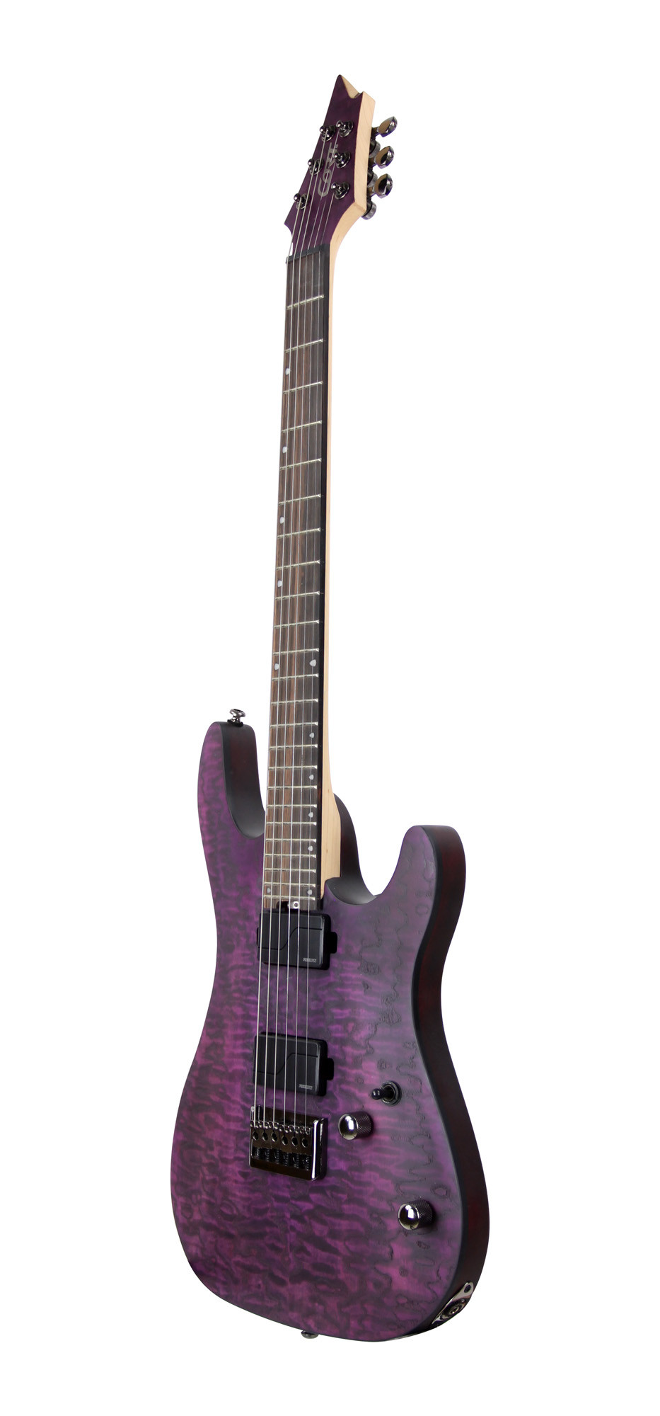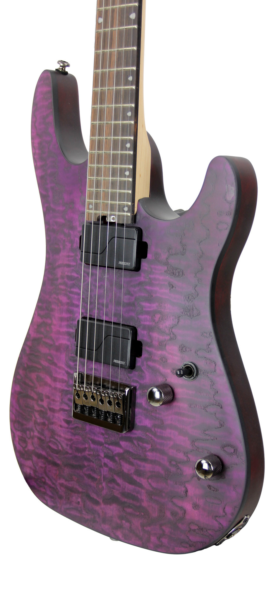 Este modelo de 6 cuerdas combina una construcción cuidada con componentes diseñados para ofrecer una gran fiabilidad de ejecución. Su cuerpo de caoba se complementa con una tapa de fresno arenado, mientras que el diapasón de ébano contribuye a una sensación de toque precisa. El mástil atornillado de 5 piezas de arce y amaranth, el puente fijo con cuerdas a través del cuerpo y las clavijas de bloqueo escalonadas forman parte de un conjunto pensado para la estabilidad y la consistencia. El acabado violeta oscuro arenado aporta una marcada identidad visual.