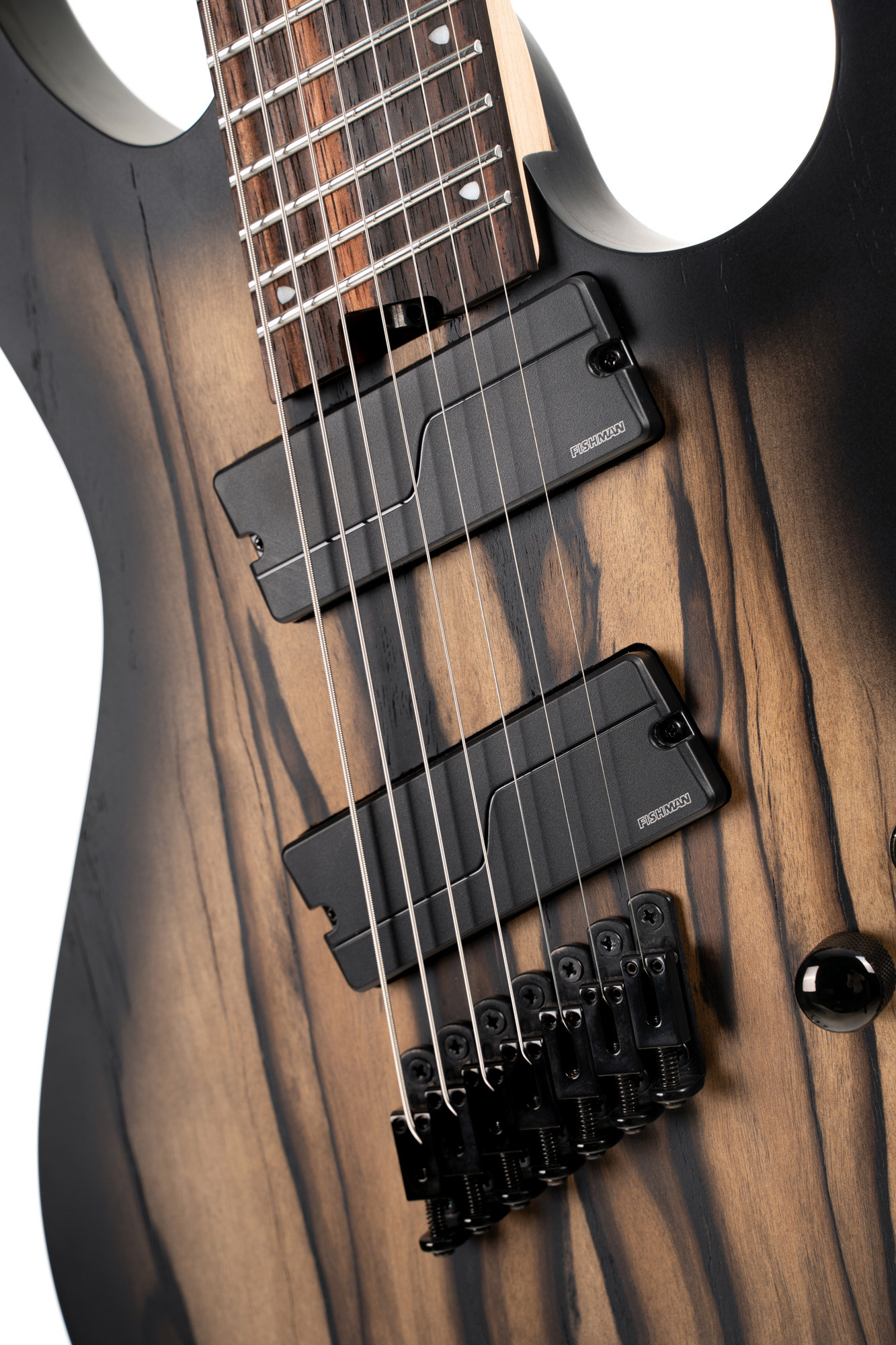 Diseñada para guitarristas que buscan una gran versatilidad y una alta precisión de ejecución, esta guitarra de 7 cuerdas combina un cuerpo de caoba con una tapa de ébano “Pale Moon” para una construcción cuidada y un resultado visual distintivo. Su acabado natural black burst realza su estilo moderno, mientras que el diapasón de ébano de Macassar y los 24 trastes inox en abanico contribuyen a una jugabilidad adecuada para afinaciones extendidas.