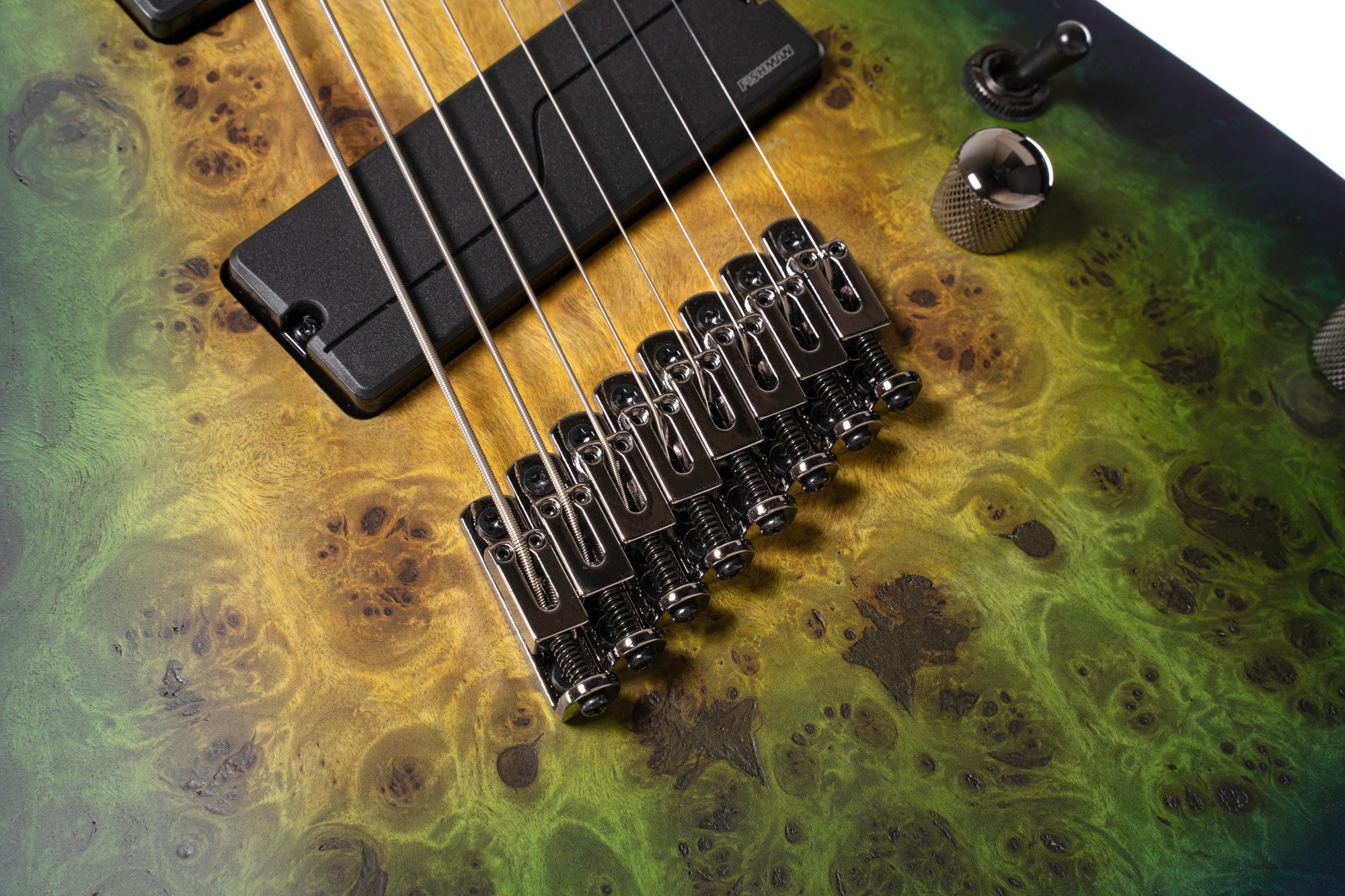 Su formato de trastes en abanico, sus 24 trastes y sus pontones individuales con cuerdas a través del cuerpo contribuyen a una buena estabilidad y a una comodidad adaptada a configuraciones técnicas. Está equipada con dos pastillas humbucker Fishman Fluence Modern, un selector de 3 posiciones, un control de volumen y uno de tono, ofreciendo una gran versatilidad sonora. Los clavijeros escalonados con bloqueo, la herrajería negro níquel y las cuerdas D'Addario NYXL0980 completan el conjunto. Acabado mariana blue burst.