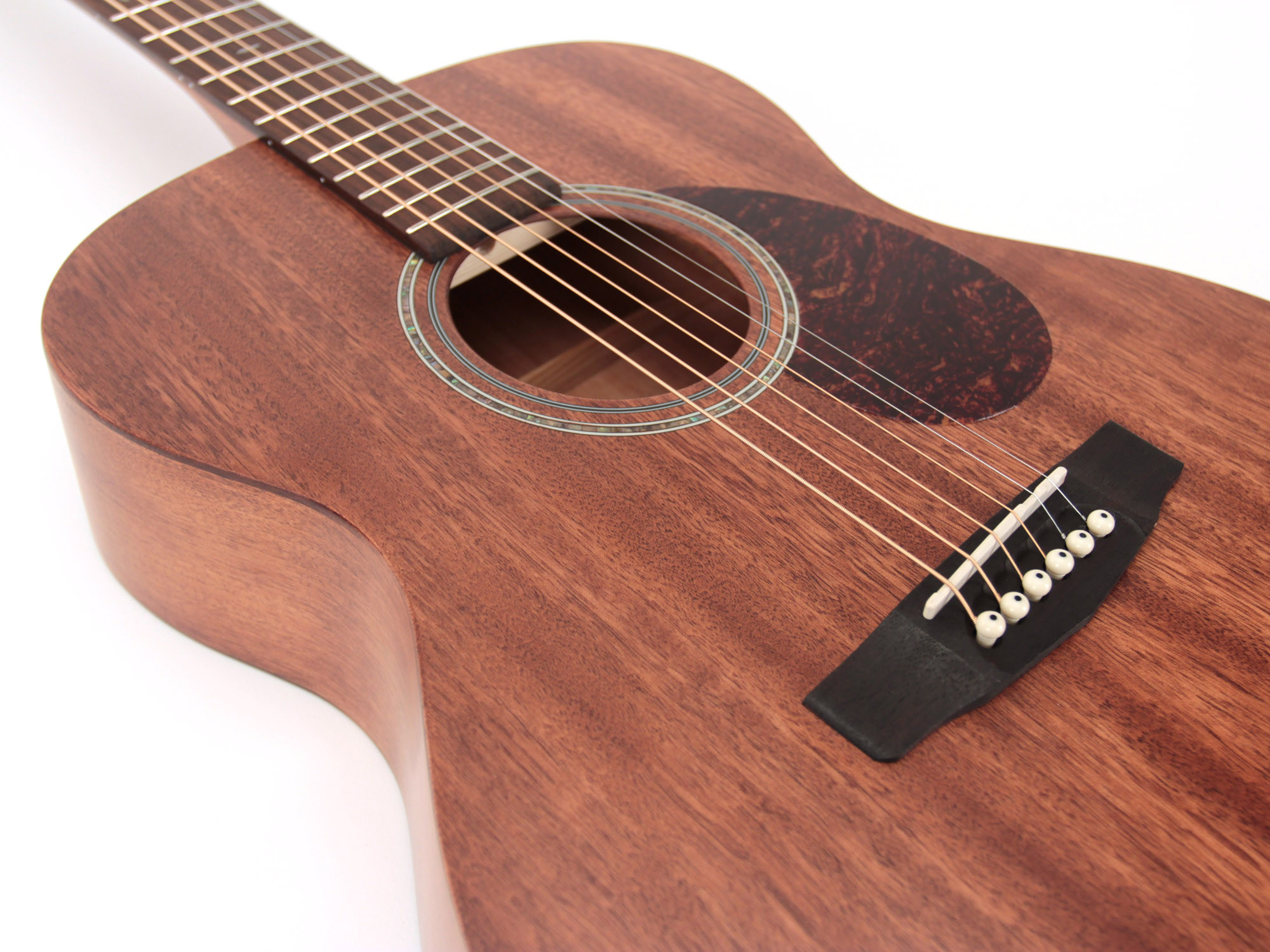 Esta guitarra de formato Orchestra Model está diseñada con una tapa de caoba maciza, fondo de caoba maciza y aros de caoba. Su mástil de caoba se combina con un diapasón de palisandro, con una cejuela de 45 mm. Su acabado natural satinado le da un aspecto sobrio y elegante.