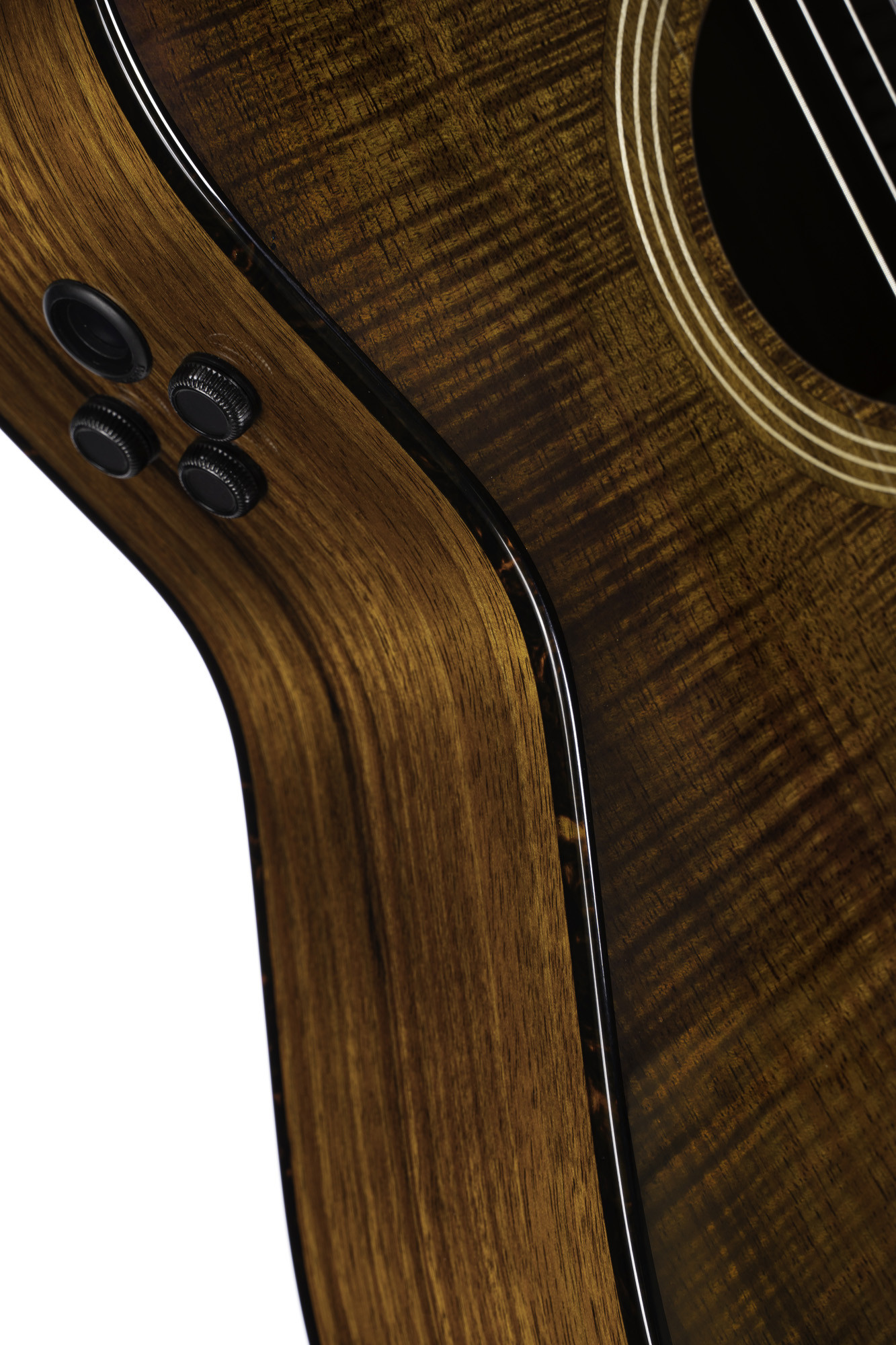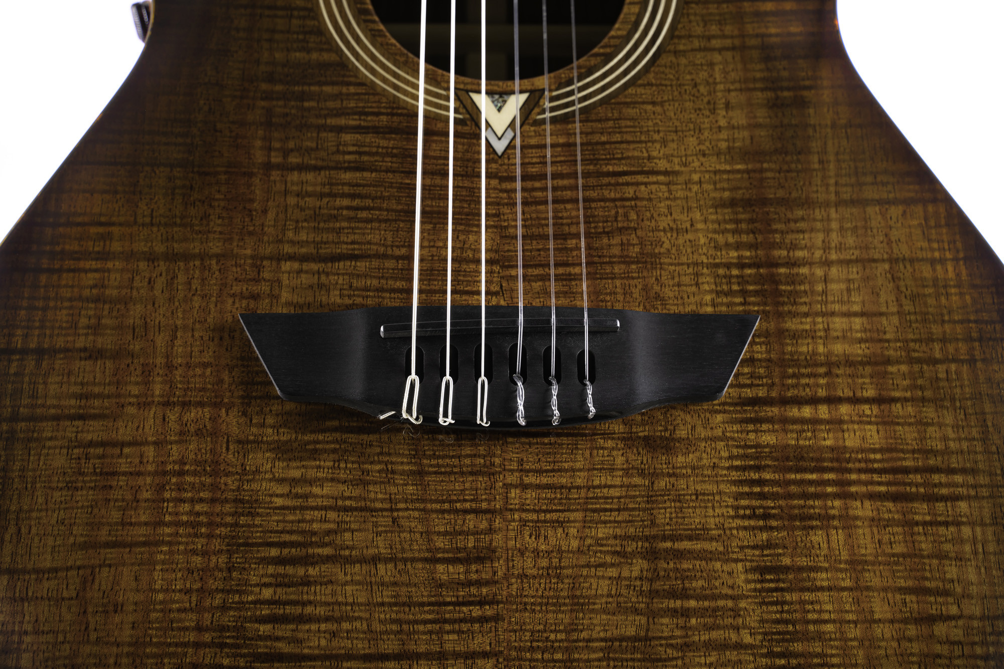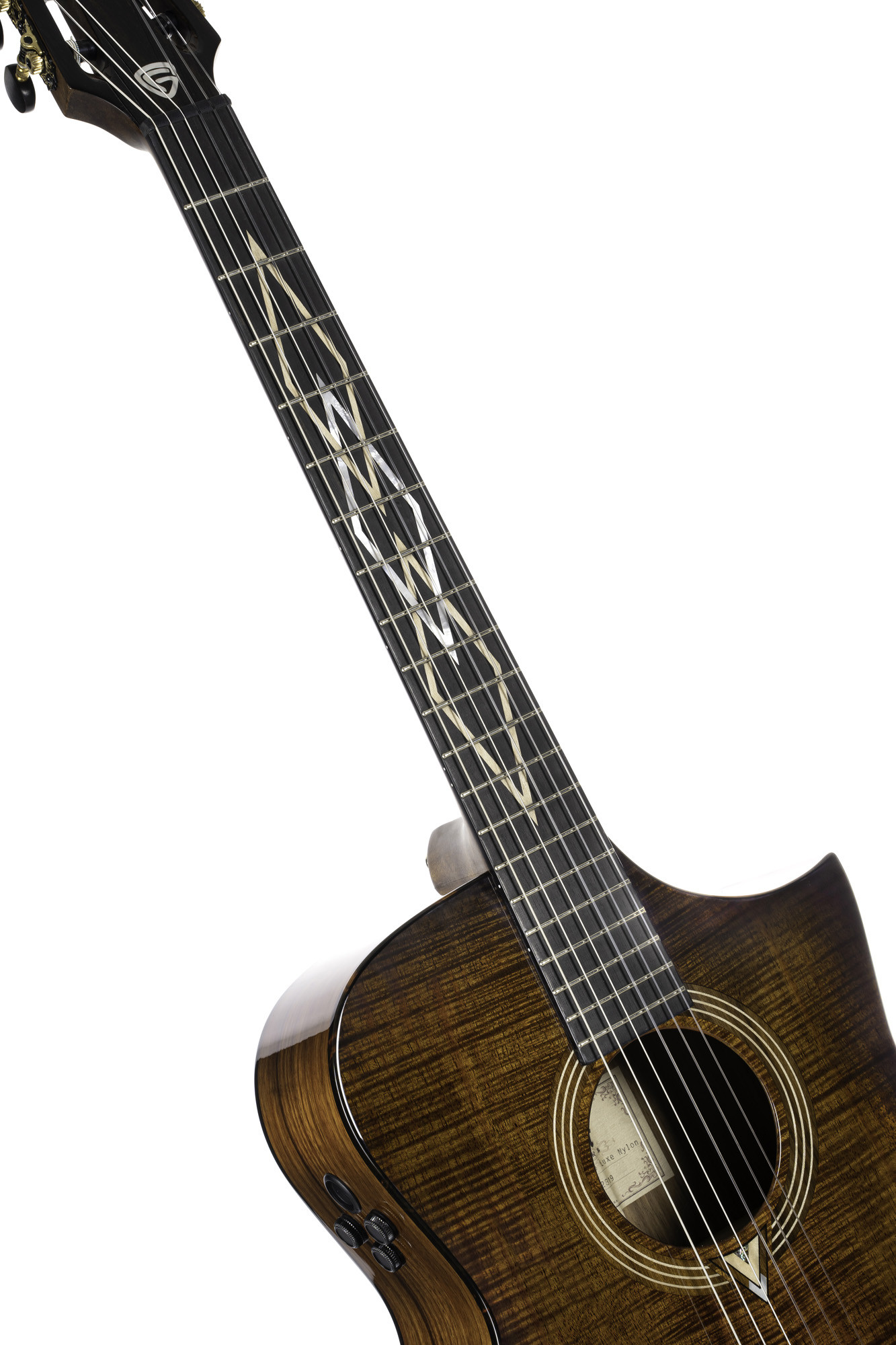 Sus principales puntos fuertes son su tapa de blackwood flameado macizo AA, su fondo y sus aros de blackwood macizo, su diapasón de ébano, su mástil de caoba, así como su electrónica Fishman Flex Blend. El conjunto se completa con componentes cuidados como las cejuelas Tusq negras y los clavijeros vintage clásicos.