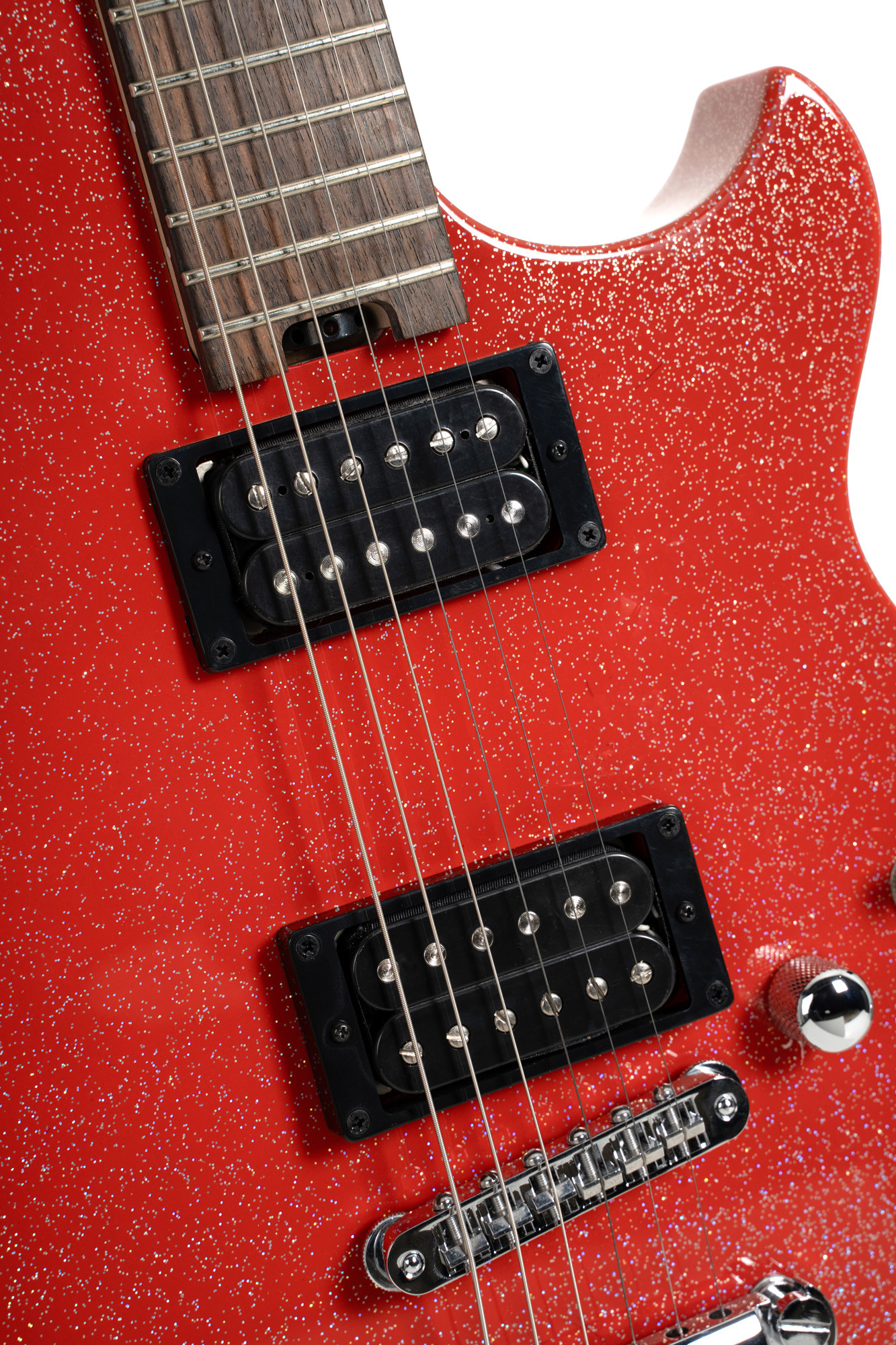 Inspirada en la firma de Matt Bellamy, esta guitarra eléctrica se distingue por un diseño pensado para la precisión, la versatilidad y el carácter visual. Combina un cuerpo de tilo con un mástil de arce con radio compensado, para un manejo cuidado. Su diapasón de laurel de 22 trastes, su cejuela de 42 mm y sus dos humbuckers Manson contribuyen a una configuración orientada a una interpretación expresiva. El botón «Kill», las clavijas de bloqueo escalonadas y la herrajes cromados completan un conjunto funcional, mientras que el acabado rojo metalizado le aporta una presencia marcada.