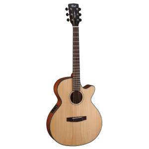Este modelo electroacústico está diseñado con una tapa de abeto macizo, combinada con fondo y aros de caoba para lograr un sonido equilibrado y cálido. El mástil de caoba ofrece una sensación de ejecución cómoda, mientras que el diapasón de palisandro completa el conjunto con un acabado cuidado. Está equipado con un sistema EQ Cort CE304T y presenta un acabado sunburst de 3 tonos.
