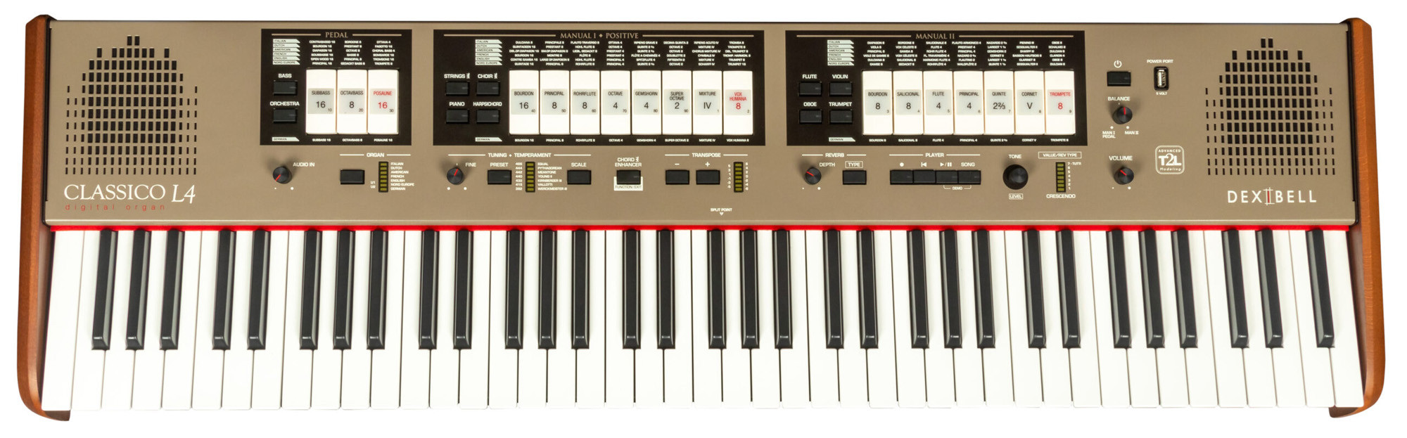 Ofrece una reproducción sonora detallada gracias a la tecnología T2L, a las muestras XXL, al procesamiento de 32 bits en coma flotante y a una polifonía ilimitada con 320 osciladores. Sus ajustes de órgano, afinación, reverberación, trémolo y ecualización permiten adaptar con precisión el sonido a sus necesidades.