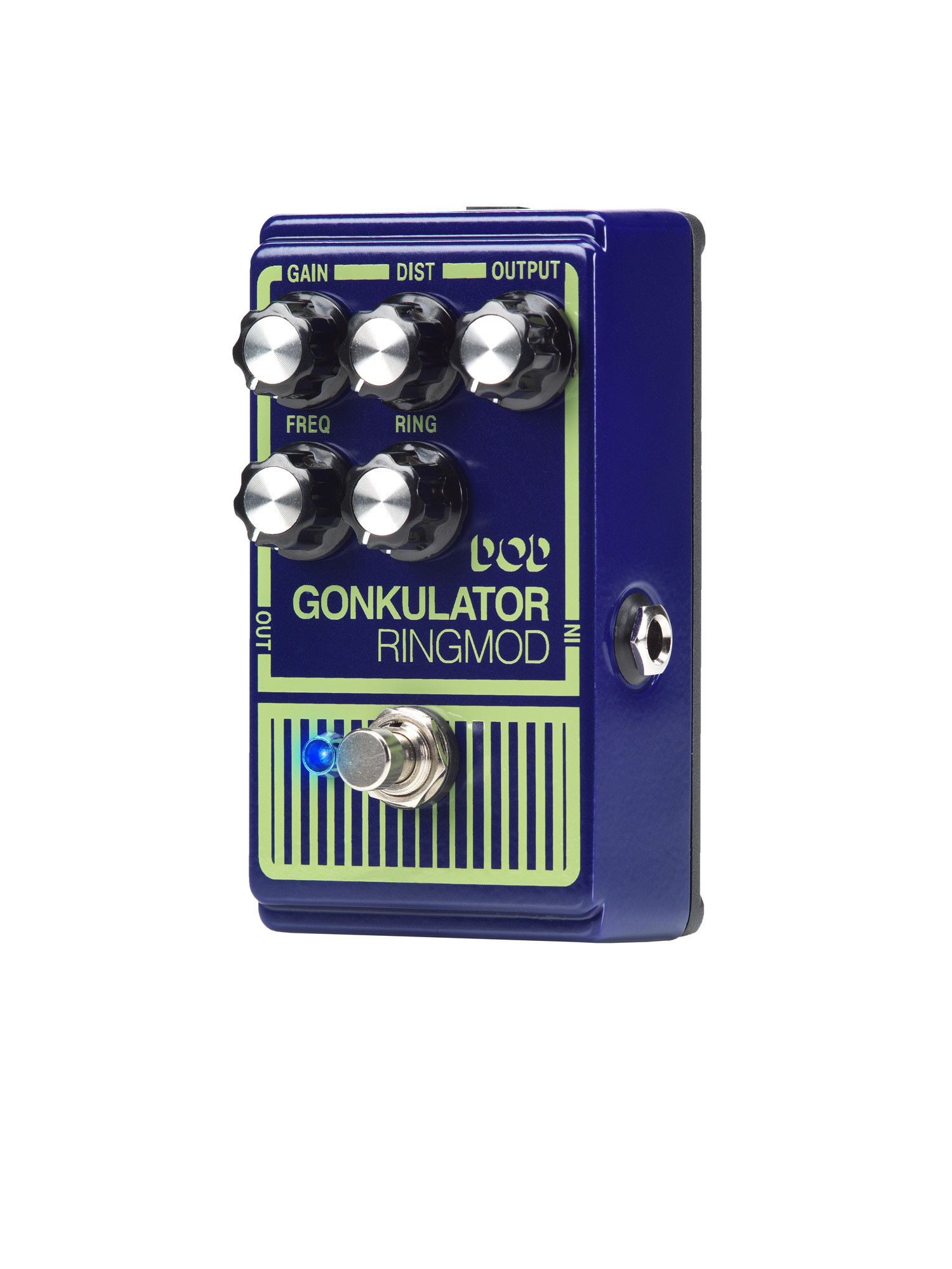 Pedal GONKULATOR, modulador en anillo con distorsión basado en el circuito original con componentes actualizados, True Bypass, caja de aluminio, dimensiones: 119 x 67 x 57 mm, peso: 280 g, alimentación de 9V mediante pila (no incluida) o adaptador de corriente opcional.