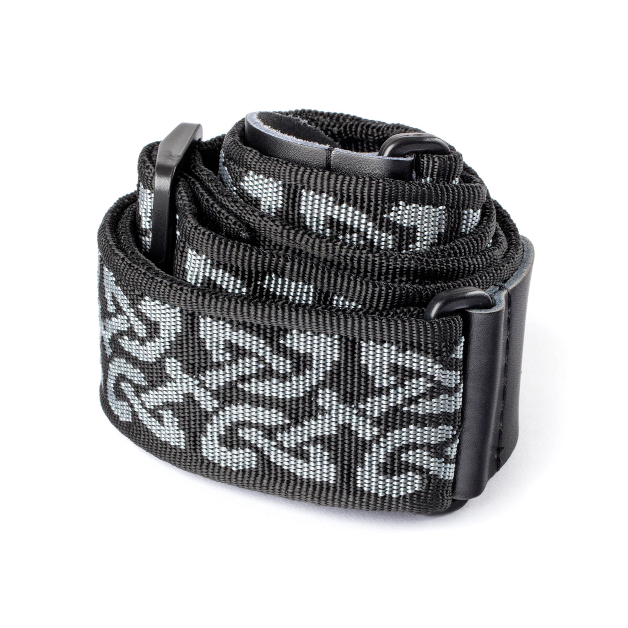 Es adecuado para músicos que buscan una correa de jacquard con acabado en cuero y una anchura de 5 cm, en un color negro y gris sobrio.
