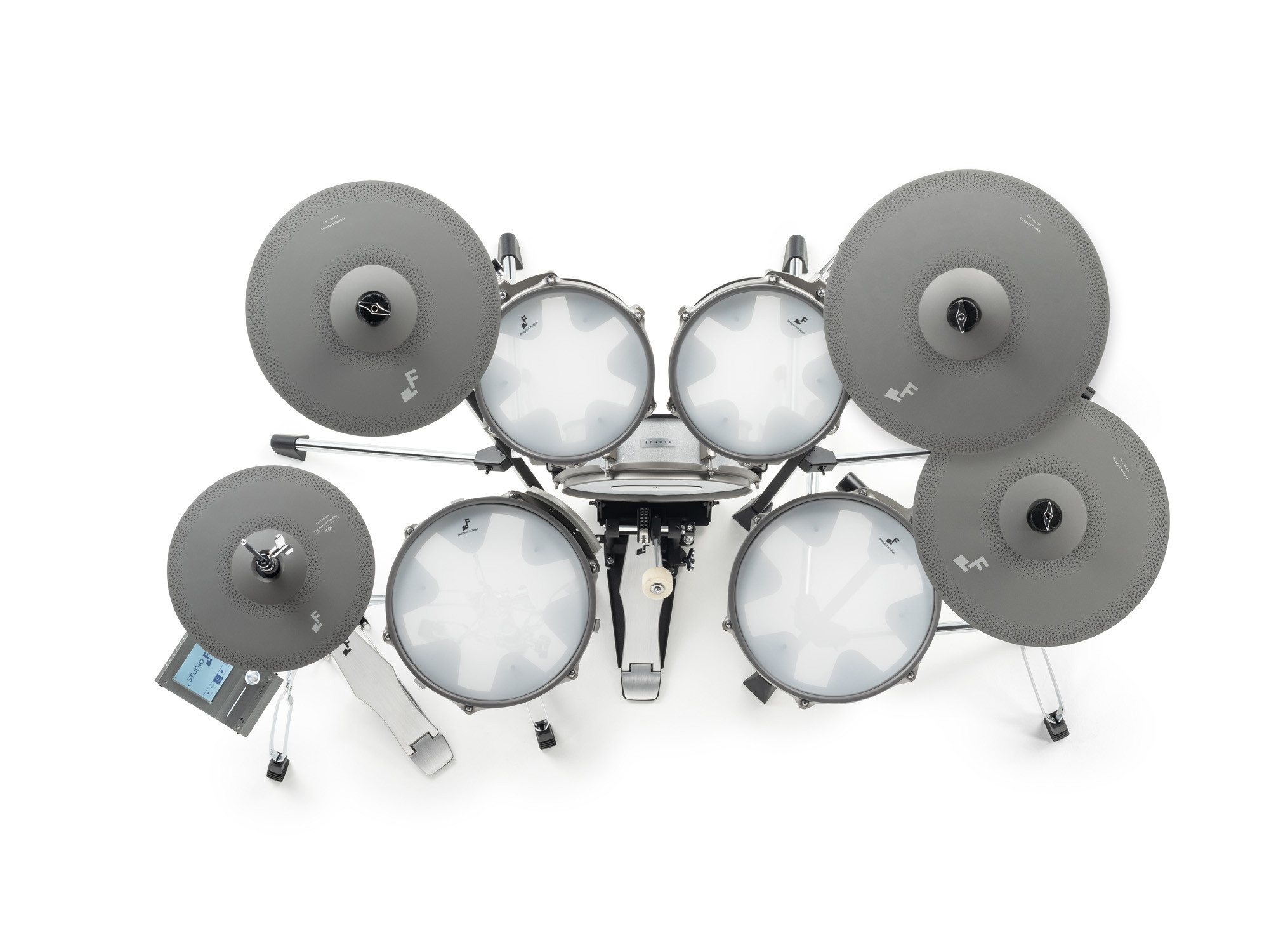 En cuanto a la configuración, los cascos están fabricados en abedul de 6 capas. El conjunto incluye un pad de bombo de 12", un pad de caja de 12"x04" con tres zonas de golpeo, dos pads de tom de 10"x3,5" con dos zonas de golpeo, un pad de tom de 12"x04" con dos zonas de golpeo, un pad de hi-hat de 12" con dos zonas de golpeo, dos pads de plato Crash de 14" con tres zonas de golpeo y función de choke y un pad de plato Ride de 16" con tres zonas de golpeo y función de choke. Se incluyen tres soportes con brazos para todos los pads de tom y de plato.