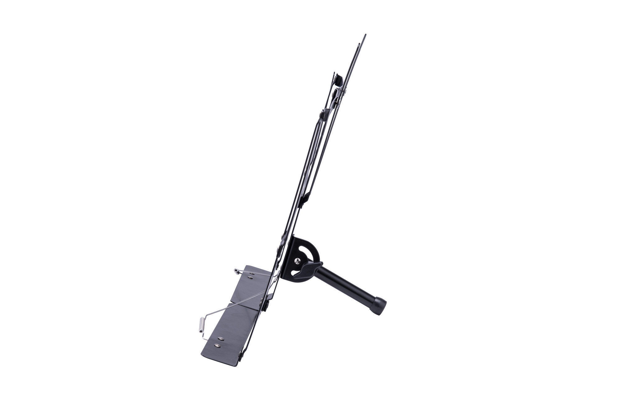 Atril de escritorio con bandeja plegable, 4 sujetapáginas, pie ajustable 180 grados con punta antideslizante, funda incluida, negro.
