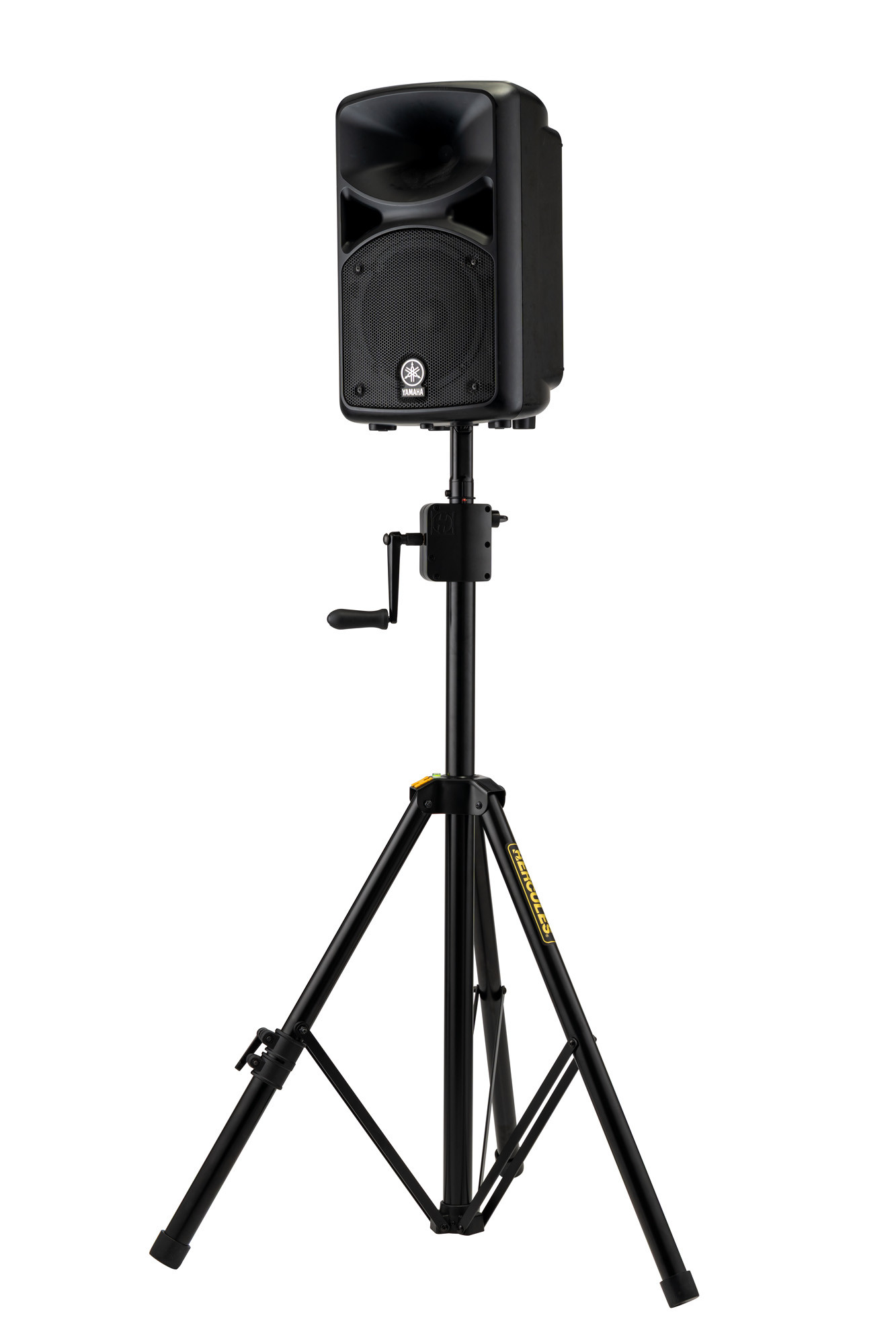 Soporte para altavoz con adaptador EZ, manivela plegable, pie ajustable para suelos irregulares, nivel de burbuja integrado, escala de altura en el tubo, estructura de acero robusta y diseño de 3 piezas para un almacenamiento compacto y una gran estabilidad a la altura máxima.