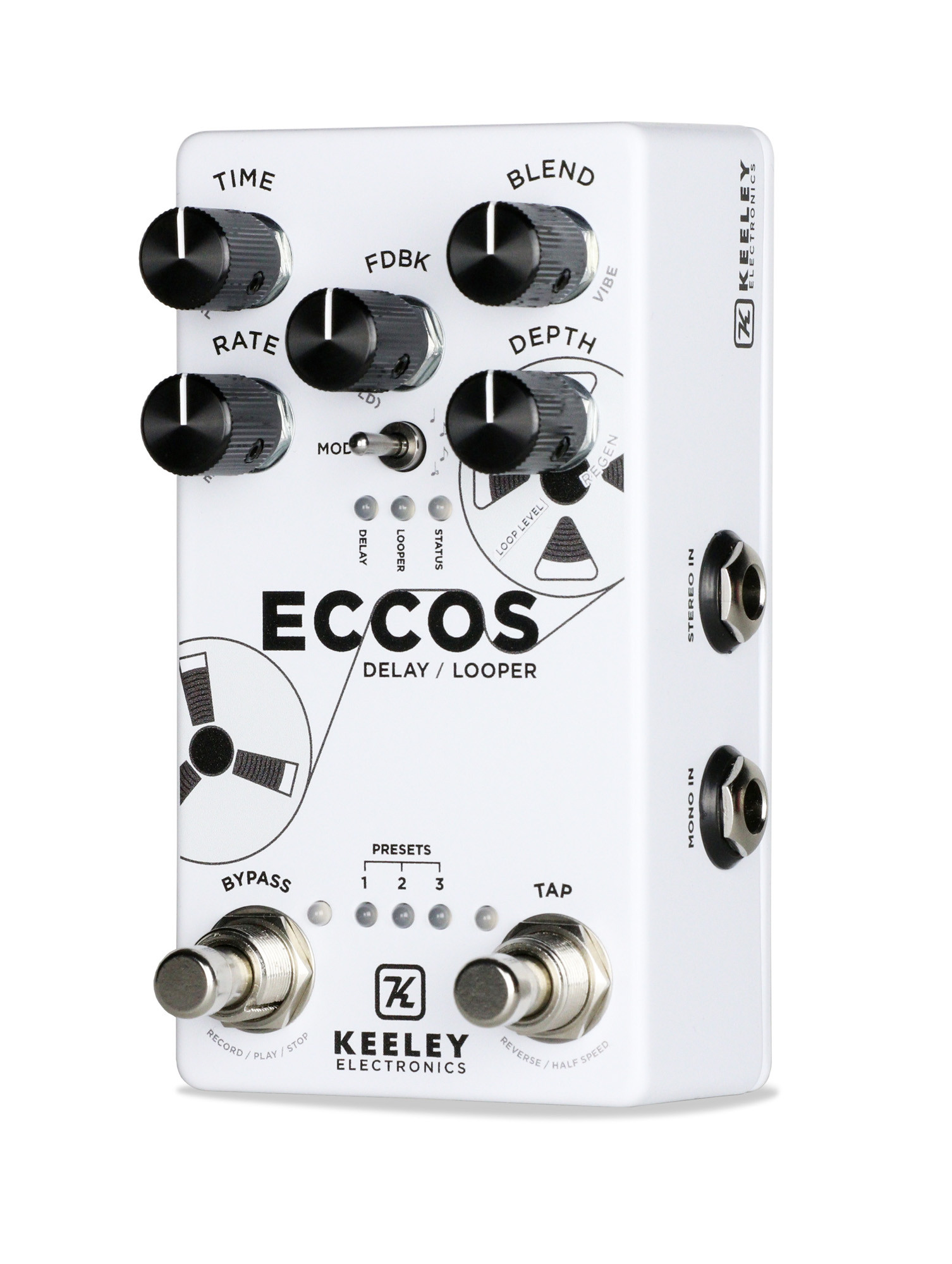 Se distingue por la combinación del delay vintage y el looper estéreo, la presencia de 3 presets, tap tempo y una entrada de expresión, en una caja de metal blanca con un formato práctico.