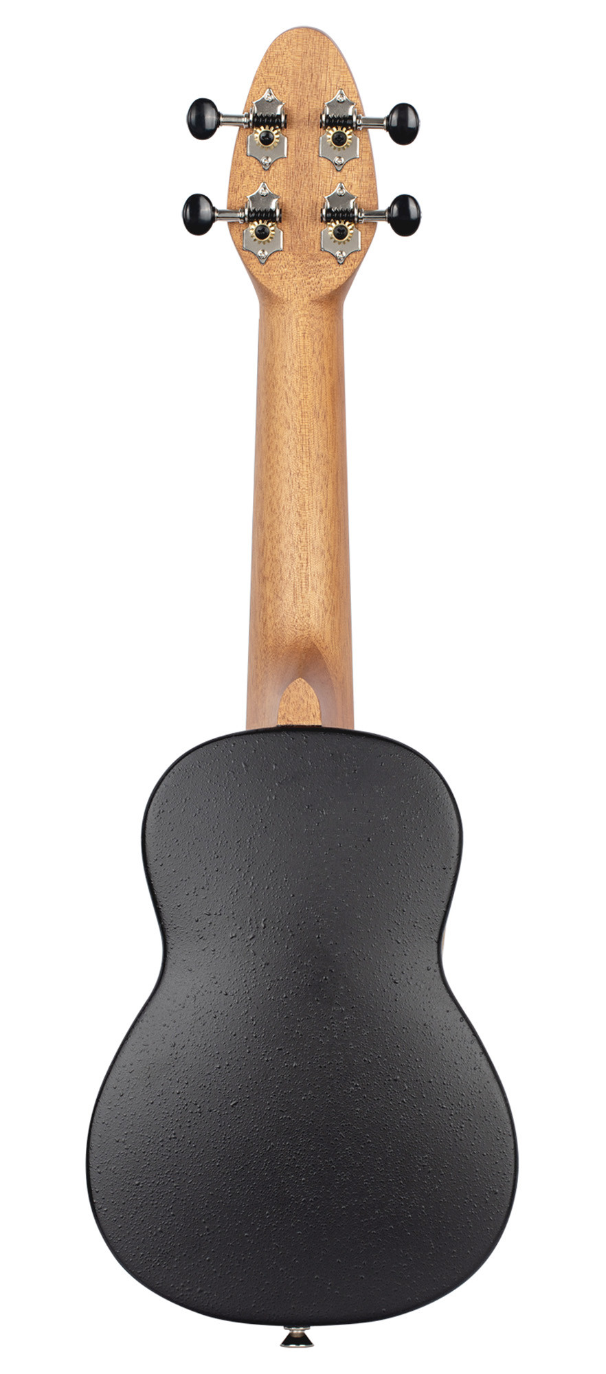 La tapa de caoba, el mástil de okoumé y el cuerpo de ABS ligeramente curvado constituyen un conjunto equilibrado. Los clavijeros abiertos con botones negros, el diapasón y el puente de ABS, así como las cuerdas Ortega, contribuyen a un uso sencillo y coherente.