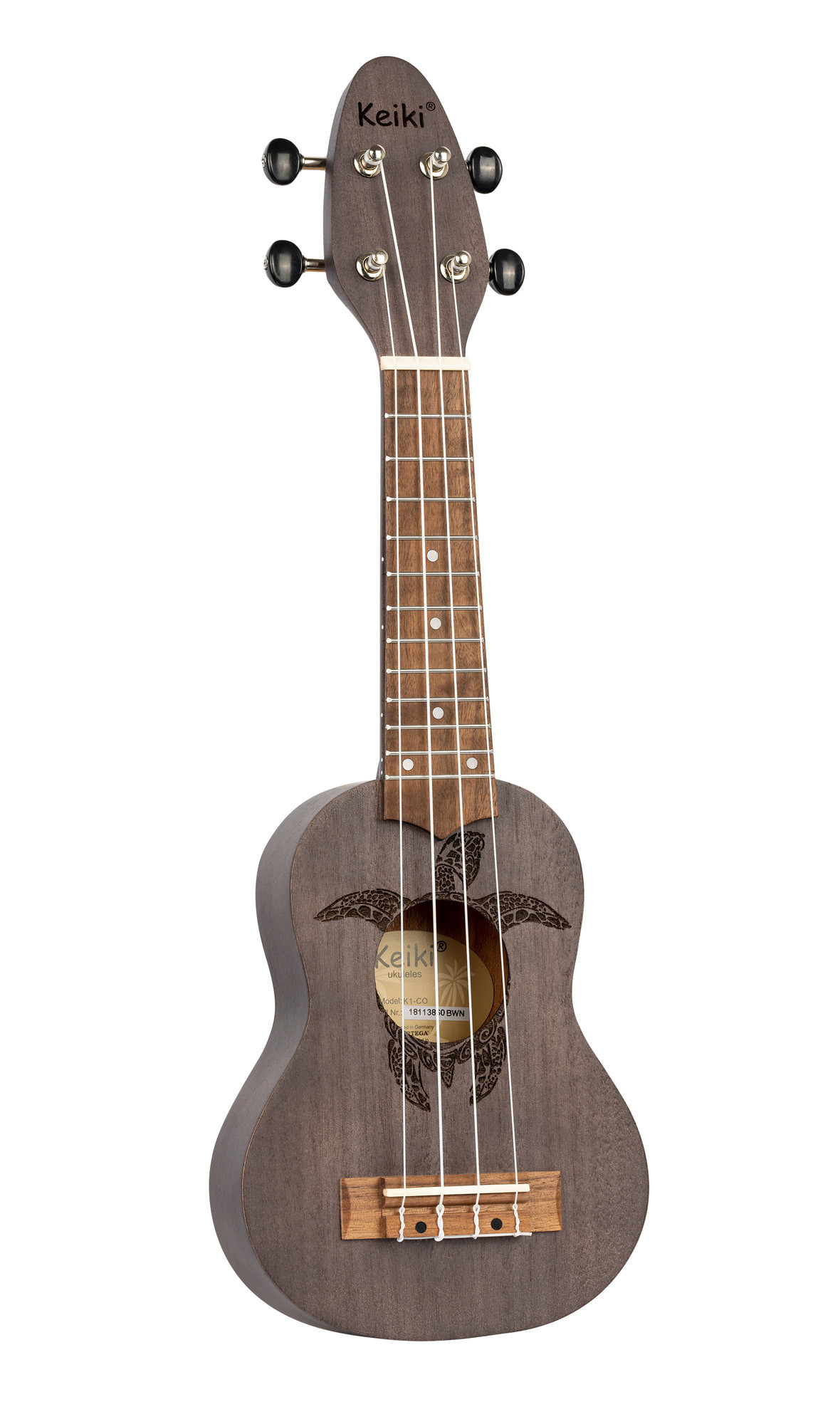 Se distingue por su formato sopranino, su acabado carbón de poro abierto, su motivo de tortuga grabado con láser y su configuración detallada con una cejuela de 32 mm, una longitud de escala de 284 mm y cuerdas Ortega.