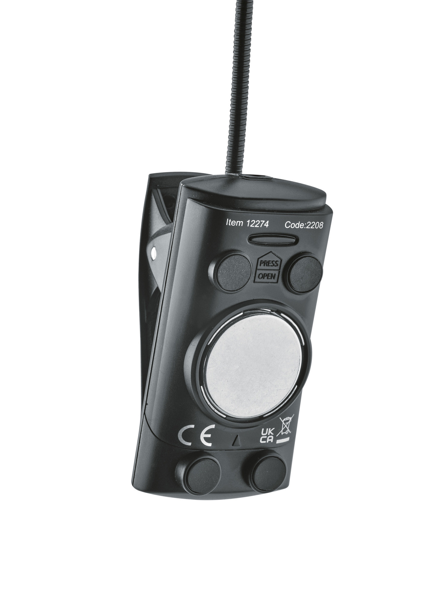 Su clip extraancho permite fijarla en soportes de hasta 25 mm de grosor, mientras que el imán integrado también ofrece una solución de fijación sobre placas metálicas. Se entrega con 3 pilas AAA, para una autonomía anunciada de 10 horas. Un adaptador está disponible por separado.