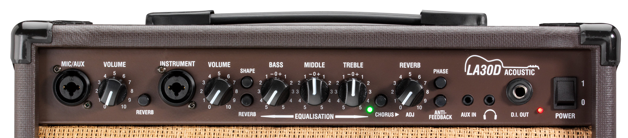 Este modelo ofrece una potencia de 30W y se basa en 2 altavoces de 6,5" de doble cono para una difusión clara y equilibrada del sonido acústico. Dispone de 2 canales, entradas combinadas jack/XLR y efectos integrados de chorus y reverberación, además de una entrada auxiliar, un circuito antiacoples, un switch de fase, un EQ gráfico de 3 bandas en el canal de instrumento, una salida de auriculares, una salida DI y alimentación fantasma. Su acabado marrón y su formato compacto lo convierten en una solución práctica para distintos usos.