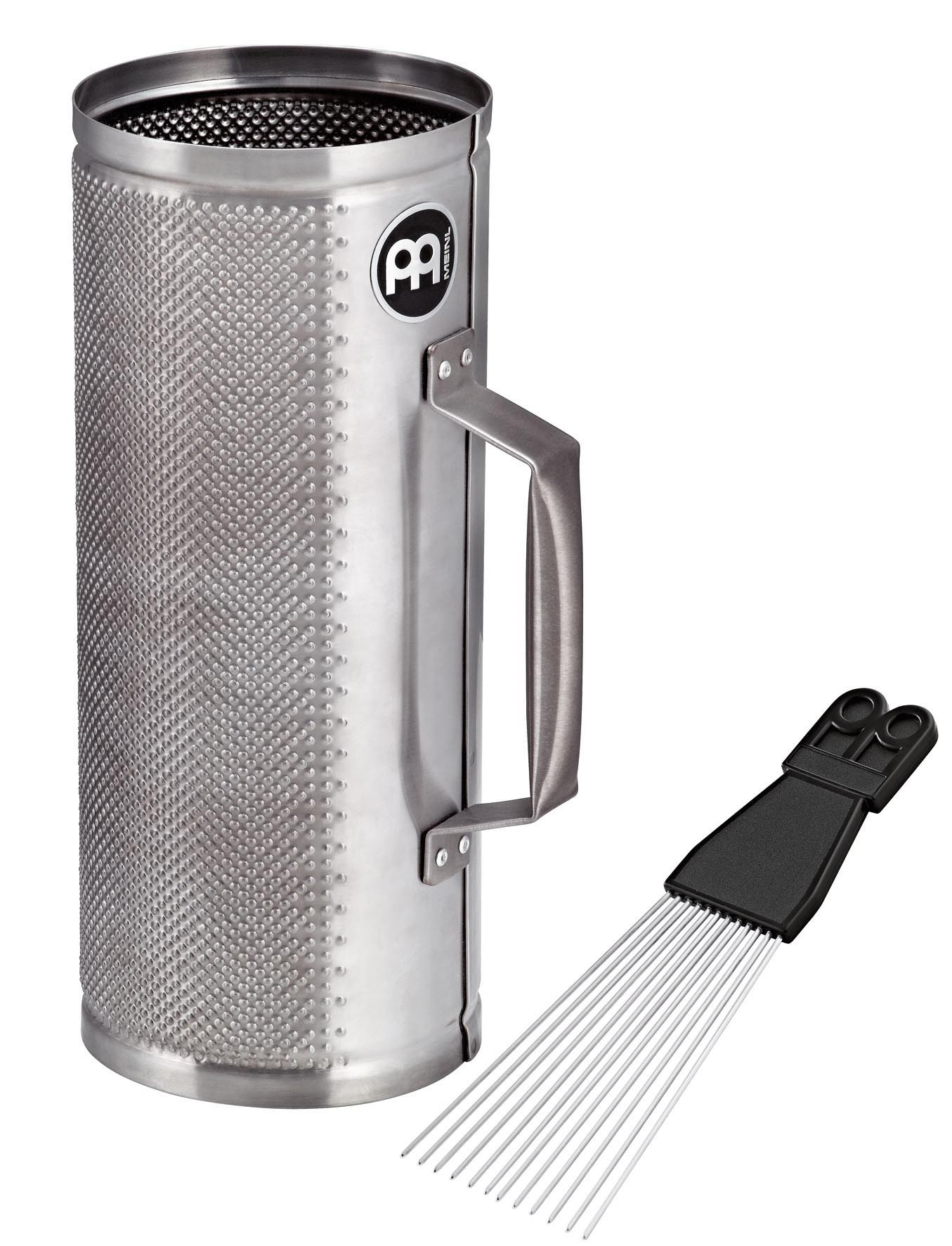 Este güiro merengue se entrega con un raspador ABS referencia MGS2. Su acabado en acero cepillado le confiere un aspecto cuidado y adecuado para un uso regular.