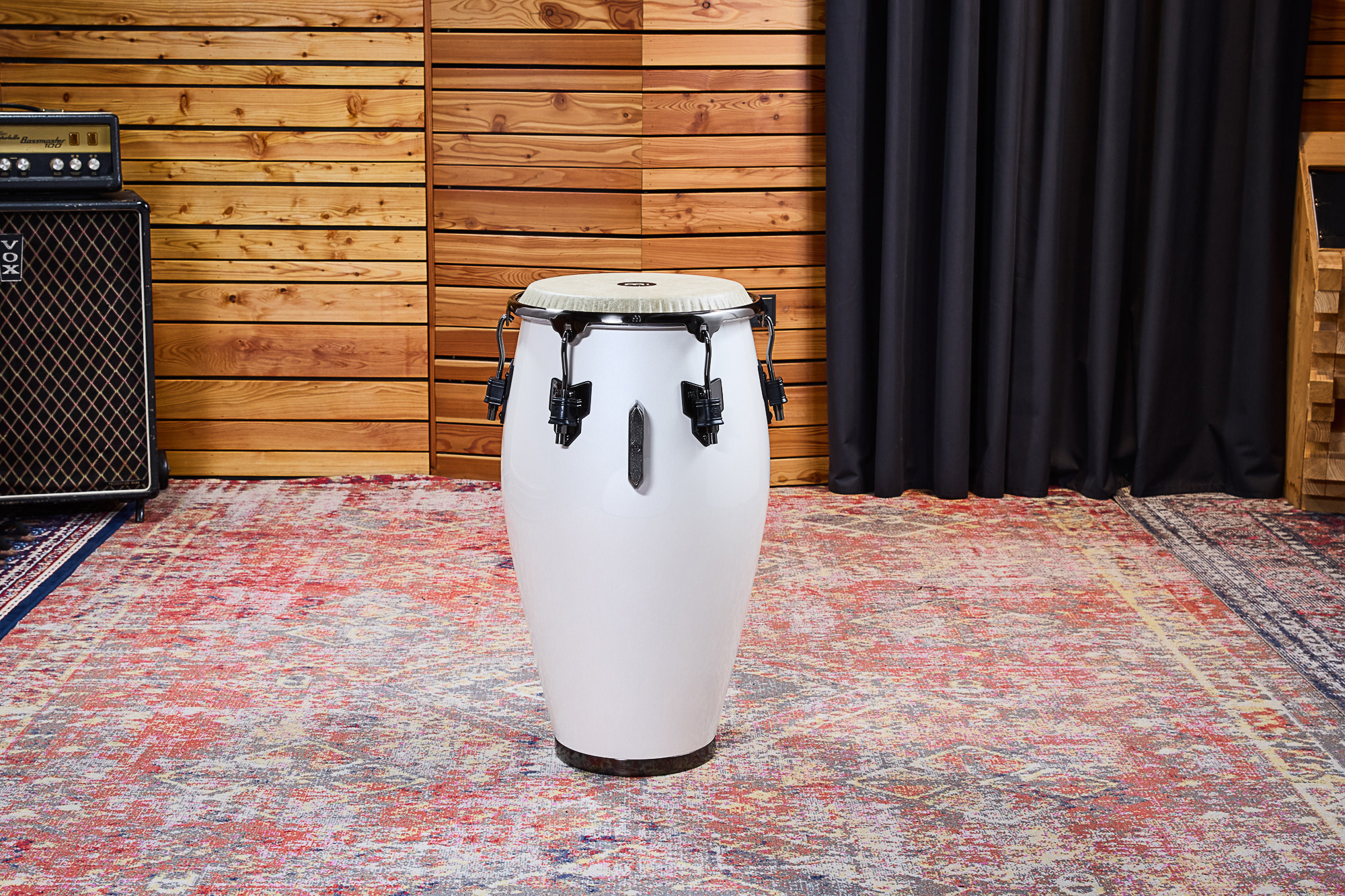 Esta tumba signature Roberto Serrano de 12"1/2 está diseñada con un casco de roble Siam de 3 capas, para una estructura cuidada y un elegante acabado Pearl White. Su altura de 76,2 cm y su parche Remo Fiberskyn contribuyen a una comodidad de interpretación adaptada a un uso exigente. Está equipada con ganchos de 10 mm, aros redondeados SSR de 4 mm y herrajes de níquel cepillado. Incluye protectores de tirantes, una protección de goma entre el casco y los herrajes, bolsillos para accesorios y una llave de afinación en L. El modelo se entrega sin soporte.