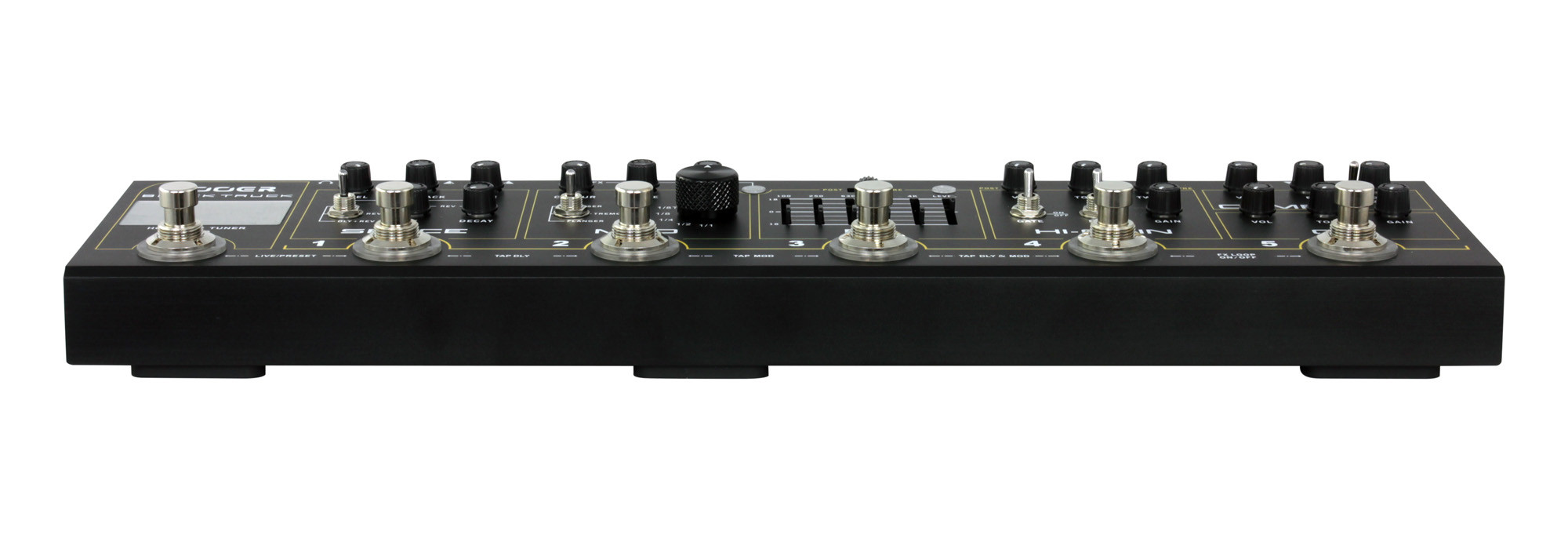 El BLACK TRUCK reúne en una sola unidad 6 efectos esenciales para guitarra: compresor, overdrive, distorsión, EQ, modulación y delay/reverb. Diseñado para simplificar la instalación sin renunciar a una configuración completa, también integra un afinador, una función Tap Tempo, un bucle de efectos para pedales externos, salidas estéreo, así como una salida de auriculares con simulación de altavoz.