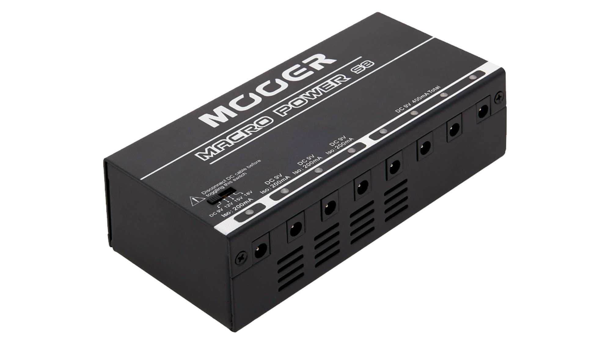 Ofrece 3 salidas de 9V de 200 mA cada una, 4 salidas de 9V con una corriente combinada de 400 mA, así como 1 salida con voltaje seleccionable entre 9V, 12V, 15V y 18V con 300 mA. También dispone de un conmutador de alimentación de red 220/110V y de protección contra sobretensiones. Suministrada con cables y una tira de velcro, está lista para instalarse rápidamente.
