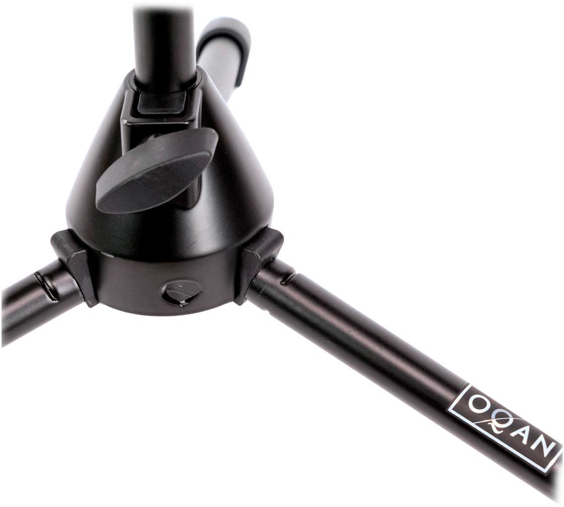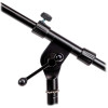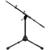 Pie de micrófono corto extensible con jirafa telescópica, diseñado para ofrecer una solución compacta y práctica en montajes donde se requiere una altura reducida. Su altura máxima es de 85 cm y presenta un acabado en color negro.