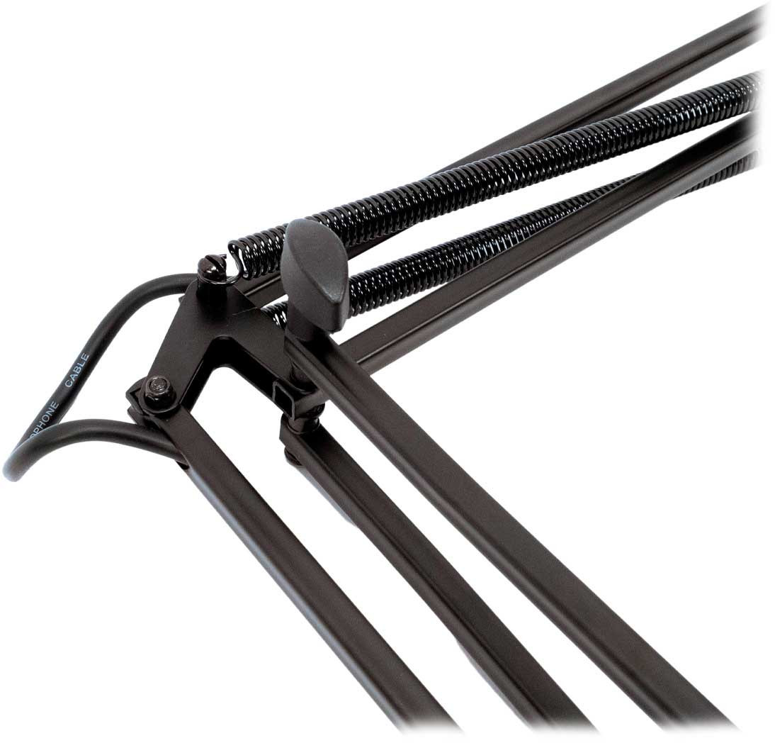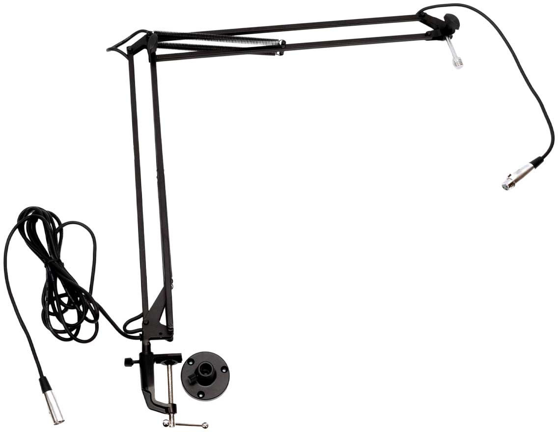 Ofrece un diseño práctico con brazo extensible tipo pantógrafo, una base fija para escritorio, un soporte tipo abrazadera, un cable de micrófono XLR-XLR de 5 m incluido, un acabado negro mate y una garantía de 3 años.