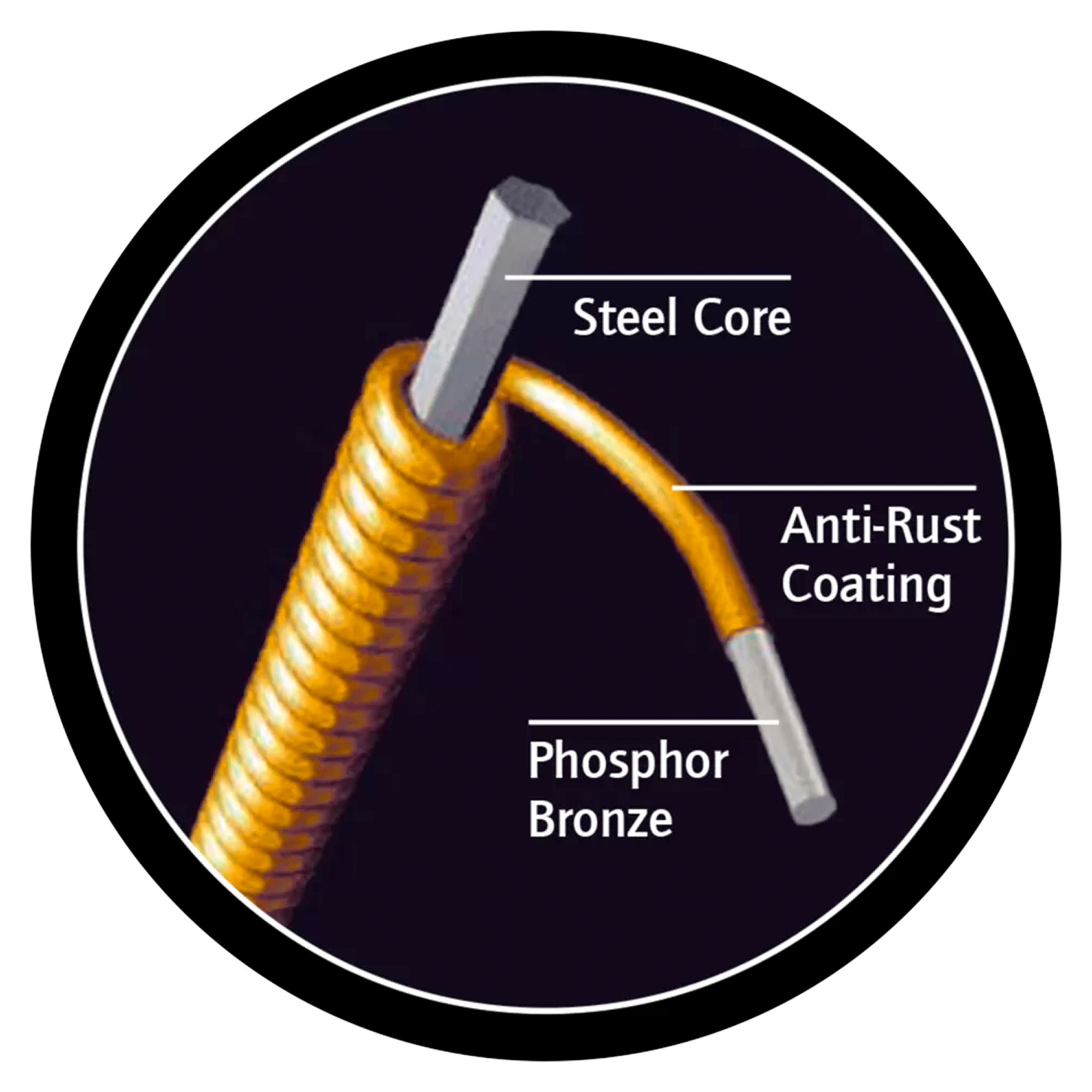 Ofrece un núcleo de acero, un entorchado redondo de bronce fosforado y un recubrimiento anticorrosión, características indicadas para este modelo.