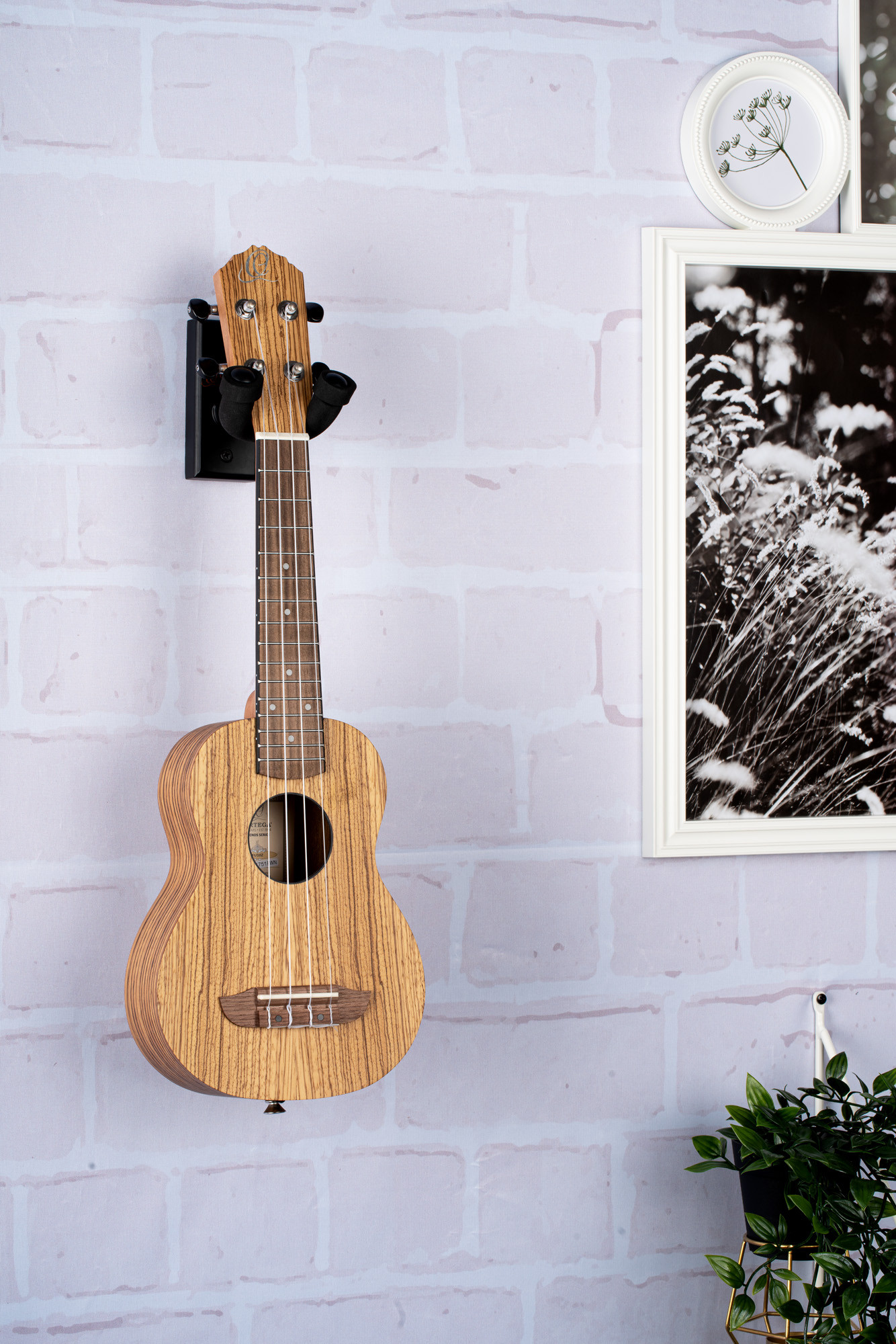 Soporte mural para ukelele con base de madera, fijación mediante 2 tornillos y horquilla recubierta de espuma, acabado negro.