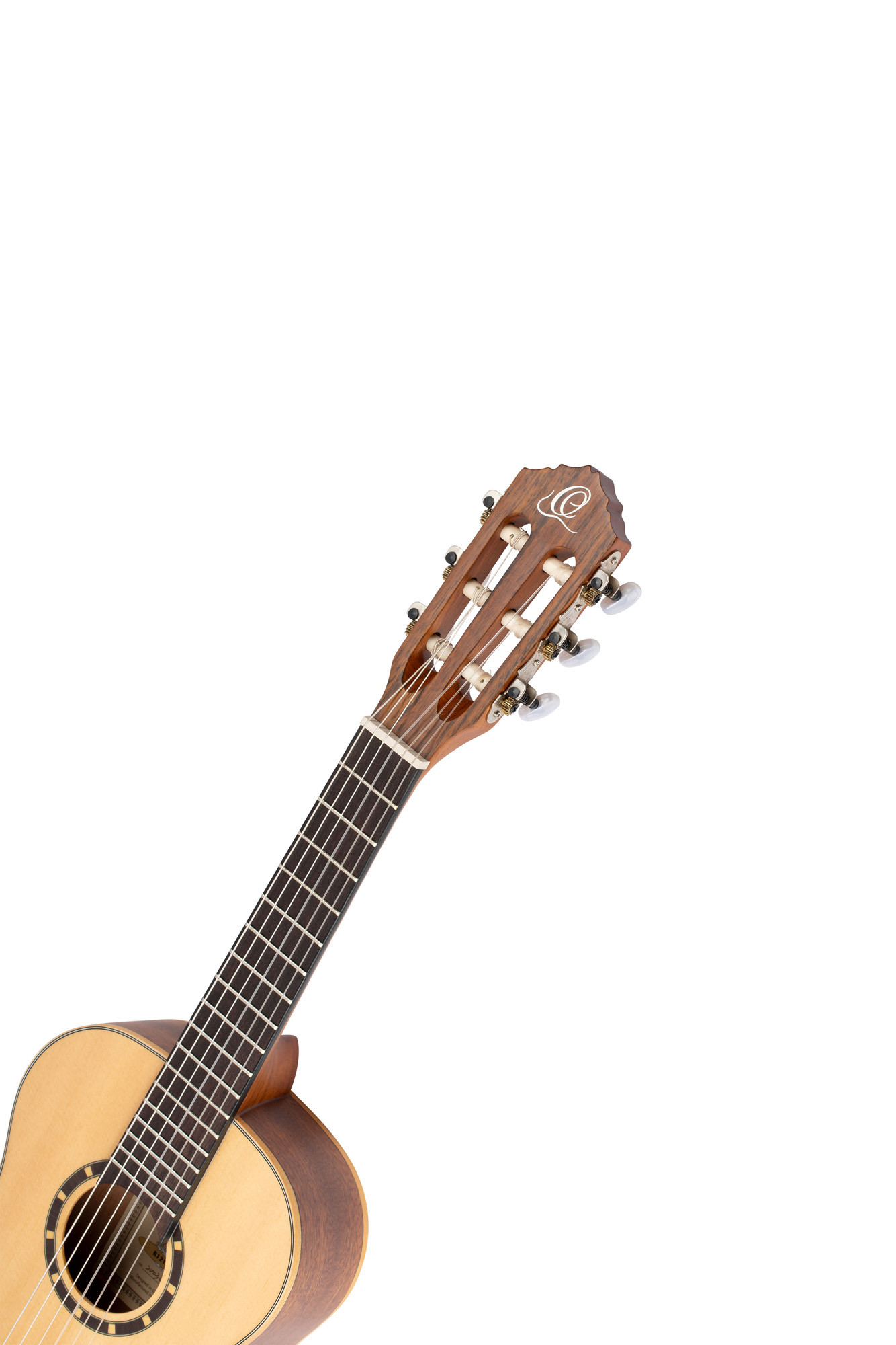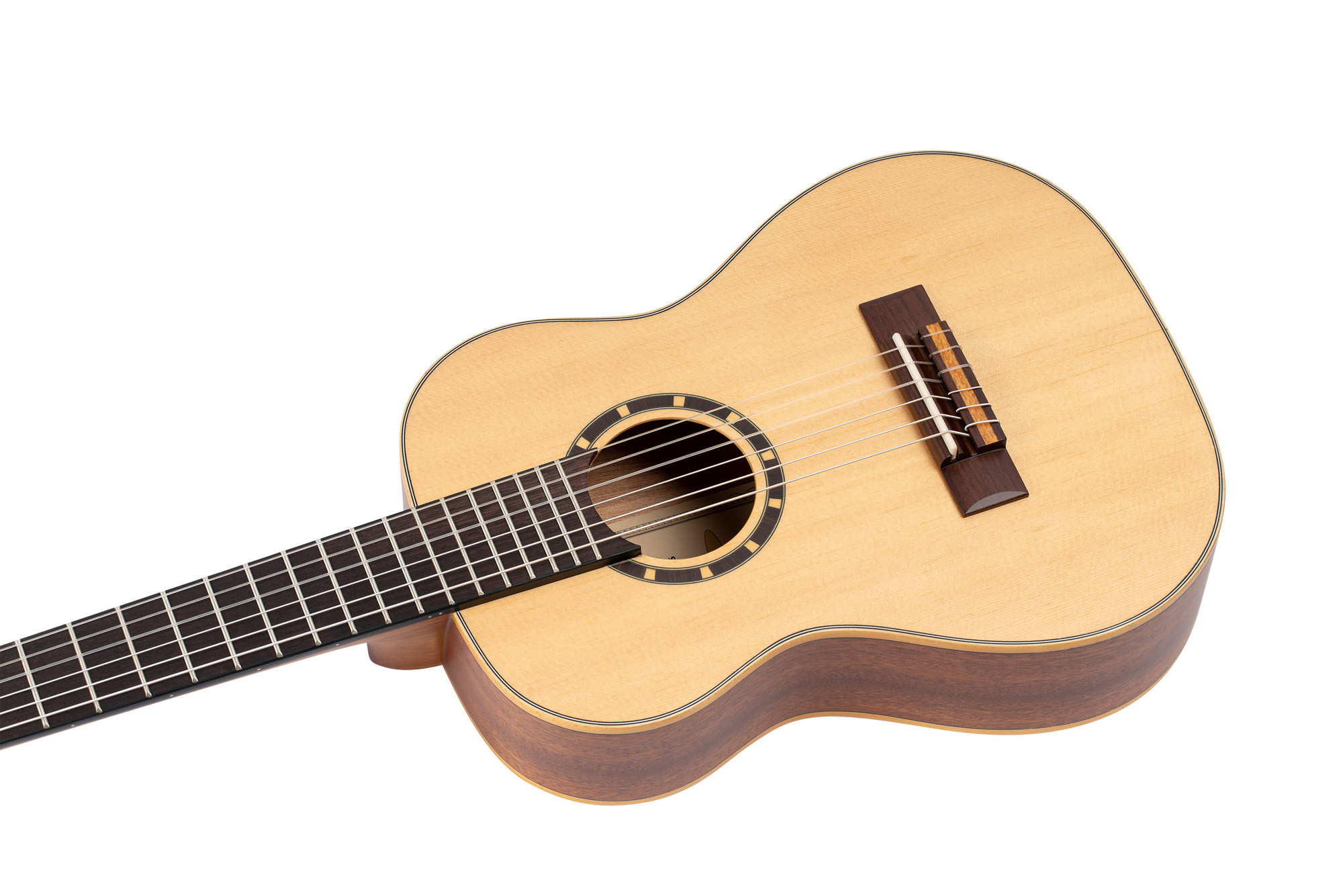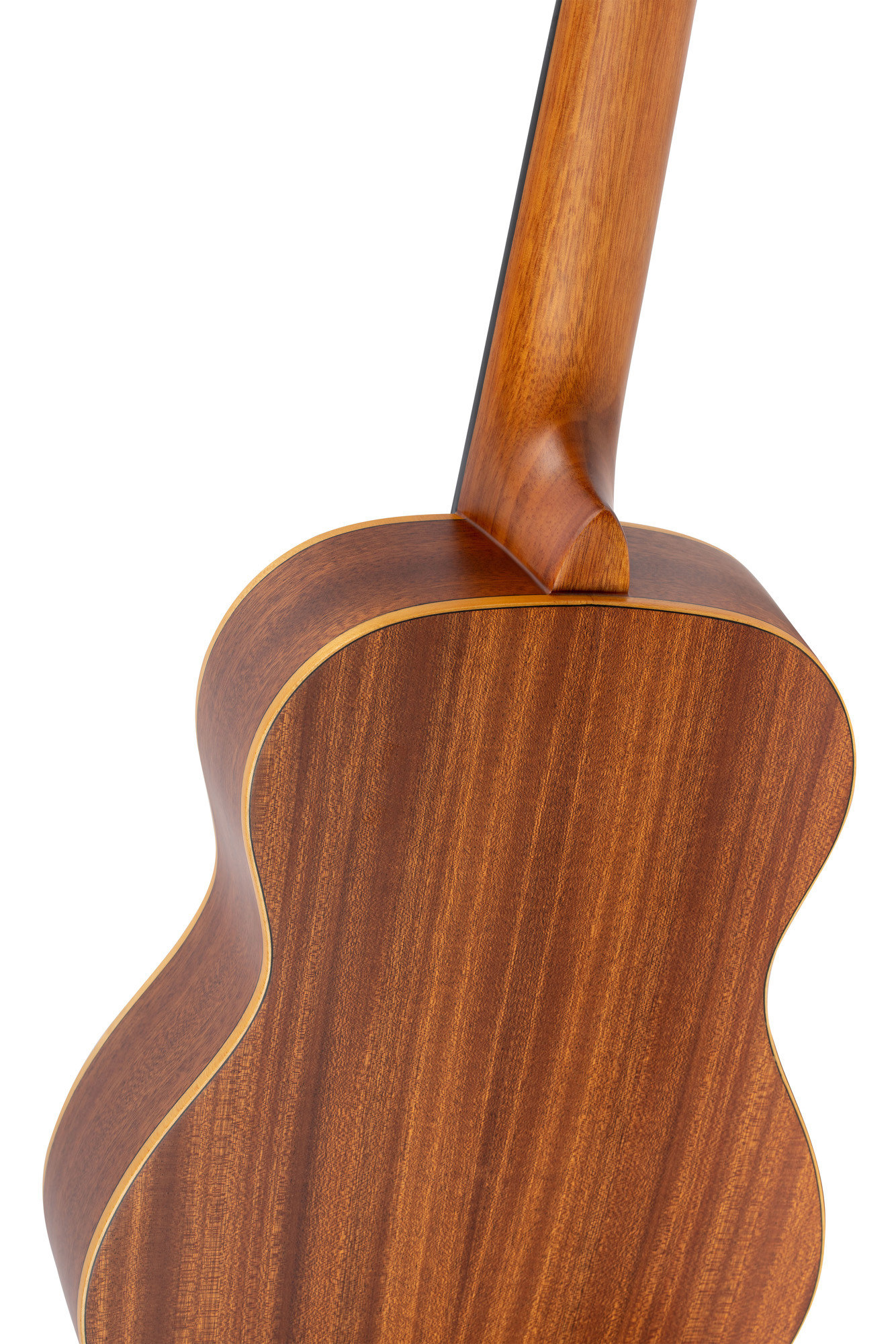 Esta guitarra de formato 1/4 está diseñada con una tapa de abeto, combinada con un fondo y unos aros de caoba. Su mástil de caoba incorpora una cejuela de 43,5 mm, para una construcción adaptada a este formato. El diapasón y el puente son de sonokeling, con un puente de 12 agujeros, un truss rod de doble acción y cuerdas D'Addario.