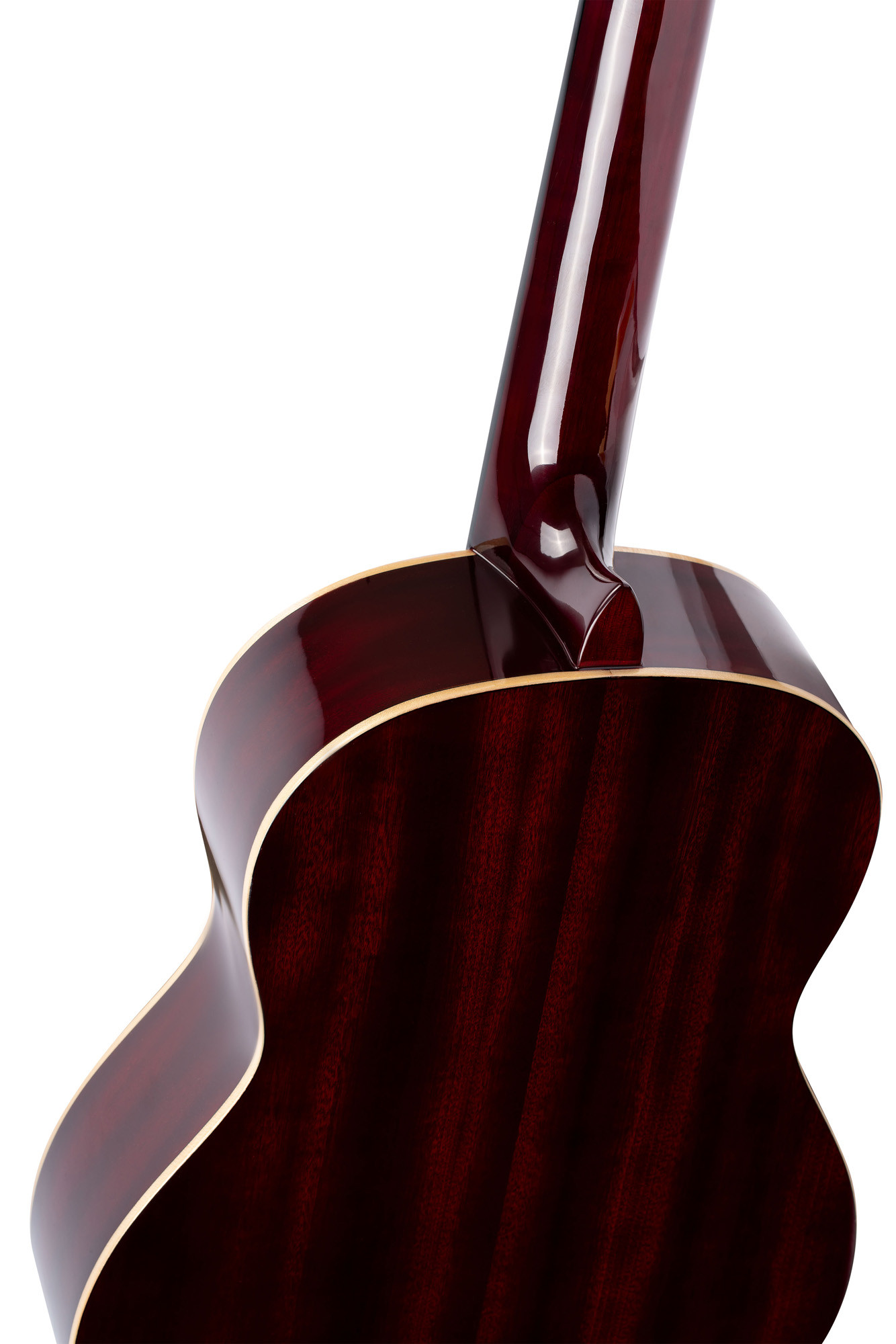 Tapa de abeto, fondo y aros de caoba, mástil de caoba con cejuela de 52 mm, acabado burdeos brillante y funda incluida.