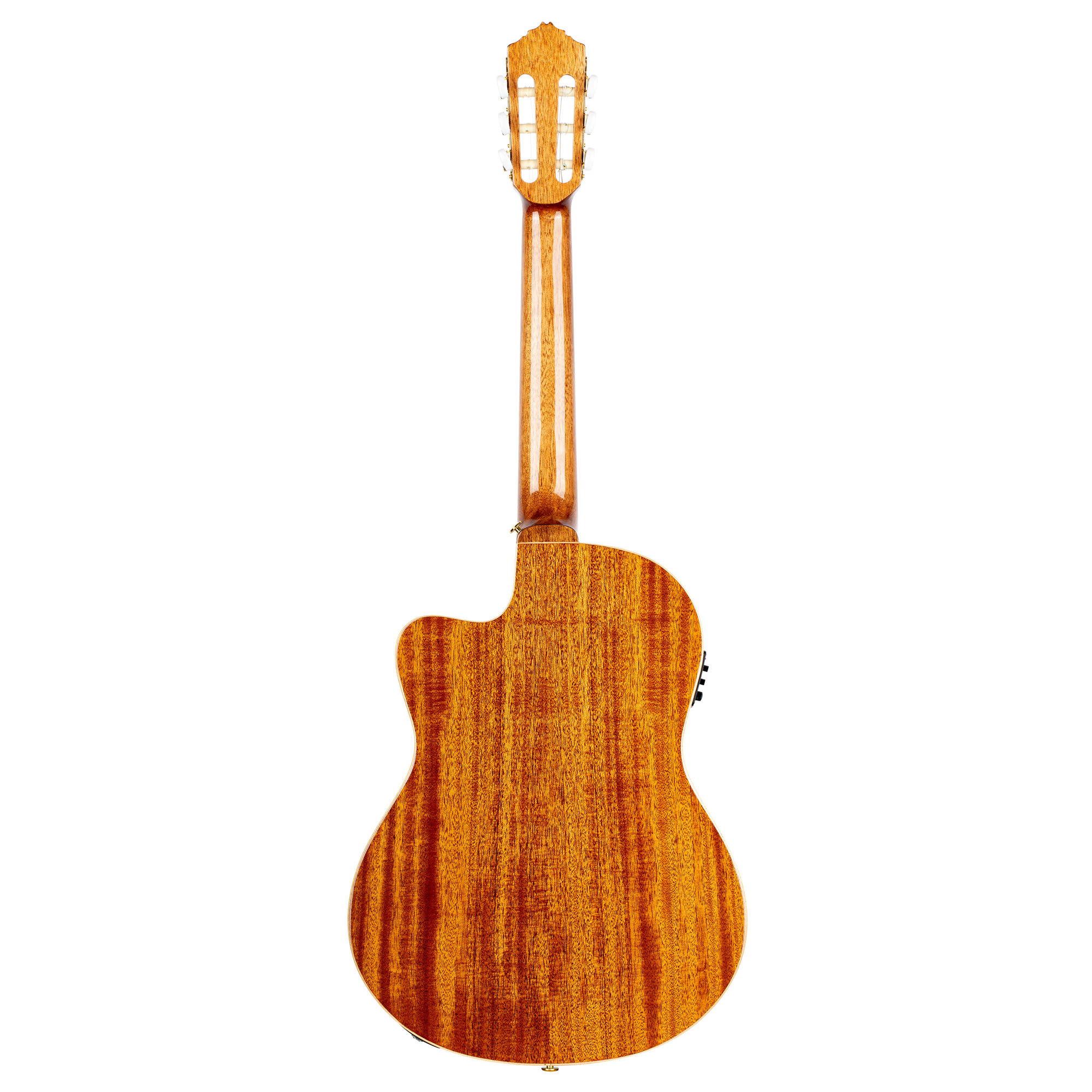 Diseñada para ofrecer un manejo cómodo y un sonido preciso, esta guitarra electroacústica destaca por su formato Slim Neck, su cutaway y su cuidada construcción. Su tapa de abeto macizo contribuye a una gran proyección, mientras que el fondo y los aros de sapele aportan un buen equilibrio tonal. El mástil de caoba con cejuela de 48 mm facilita la ejecución, y la electrónica Ortega MagusPro permite una amplificación fiable. También está equipada con diapasón y puente de palisandro, puente de 12 orificios, boca con la firma Ortega, truss rod de doble acción, cuerdas Savarez y una funda deluxe acolchada.