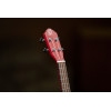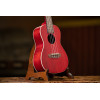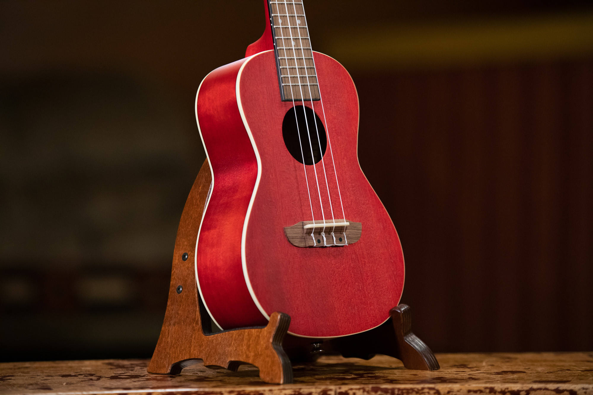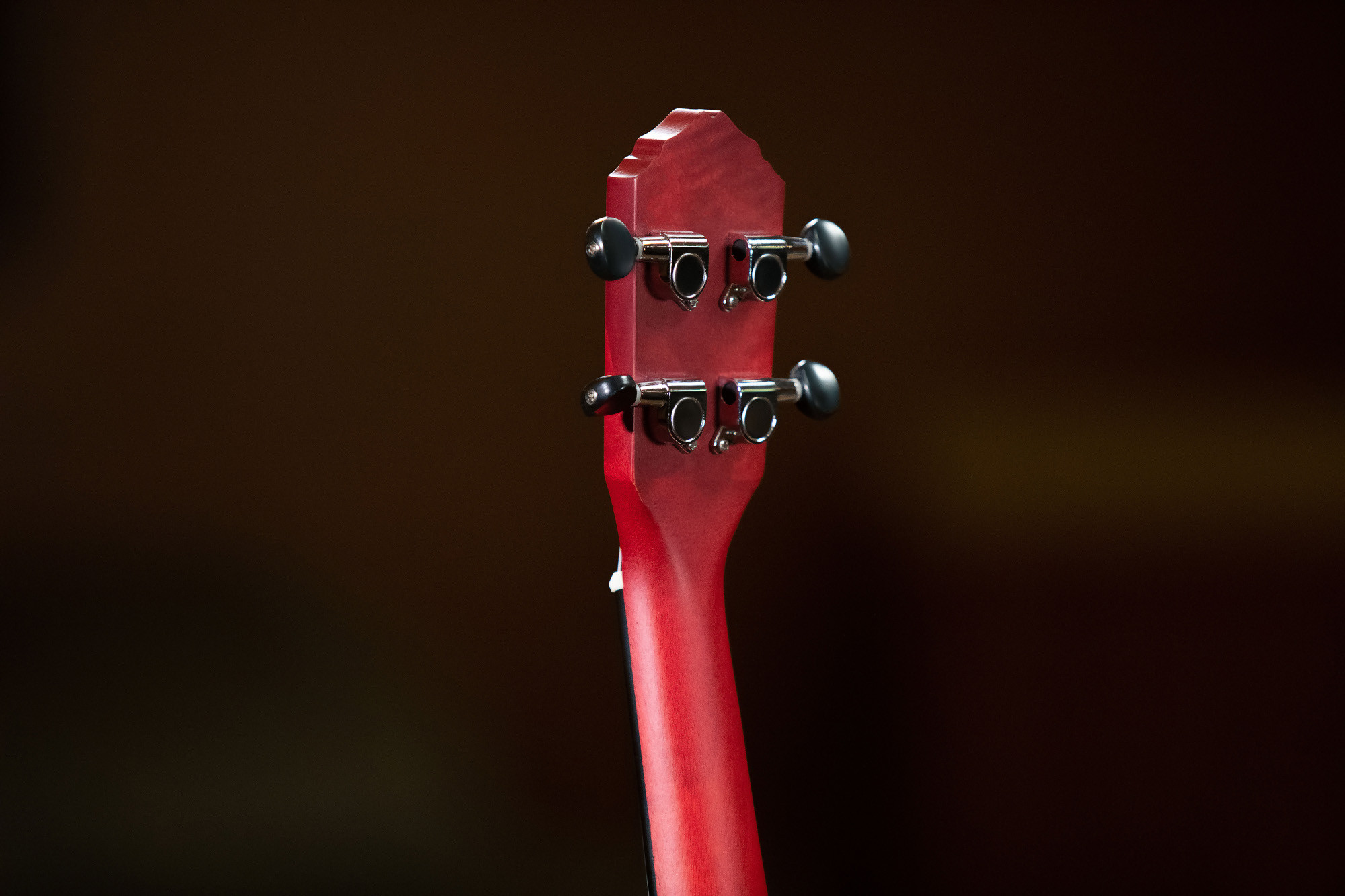 Modelo Concert, tapa de okoume, fondo y aros de okoume, mástil de caoba, acabado rojo satinado.
