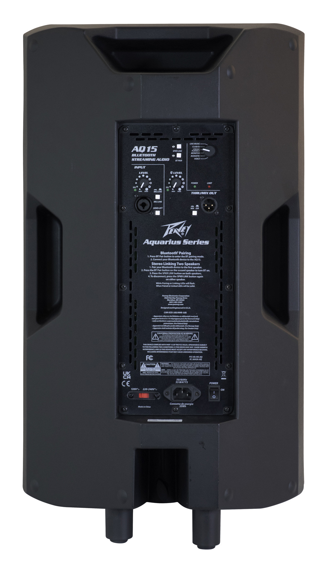 El modelo AQ-15 incorpora un procesamiento DSP de 56 bits I/O a 48 kHz y 24 bits, un compresor DX14, así como una función Bass Boost para ajustar la reproducción sonora según las necesidades. Dispone de una entrada jack Mic/Line/XLR, una salida XLR Thru/Mix, un ventilador de refrigeración integrado y varias ecualizaciones de fábrica. También es posible conectar una segunda caja acústica para crear una imagen estéreo.