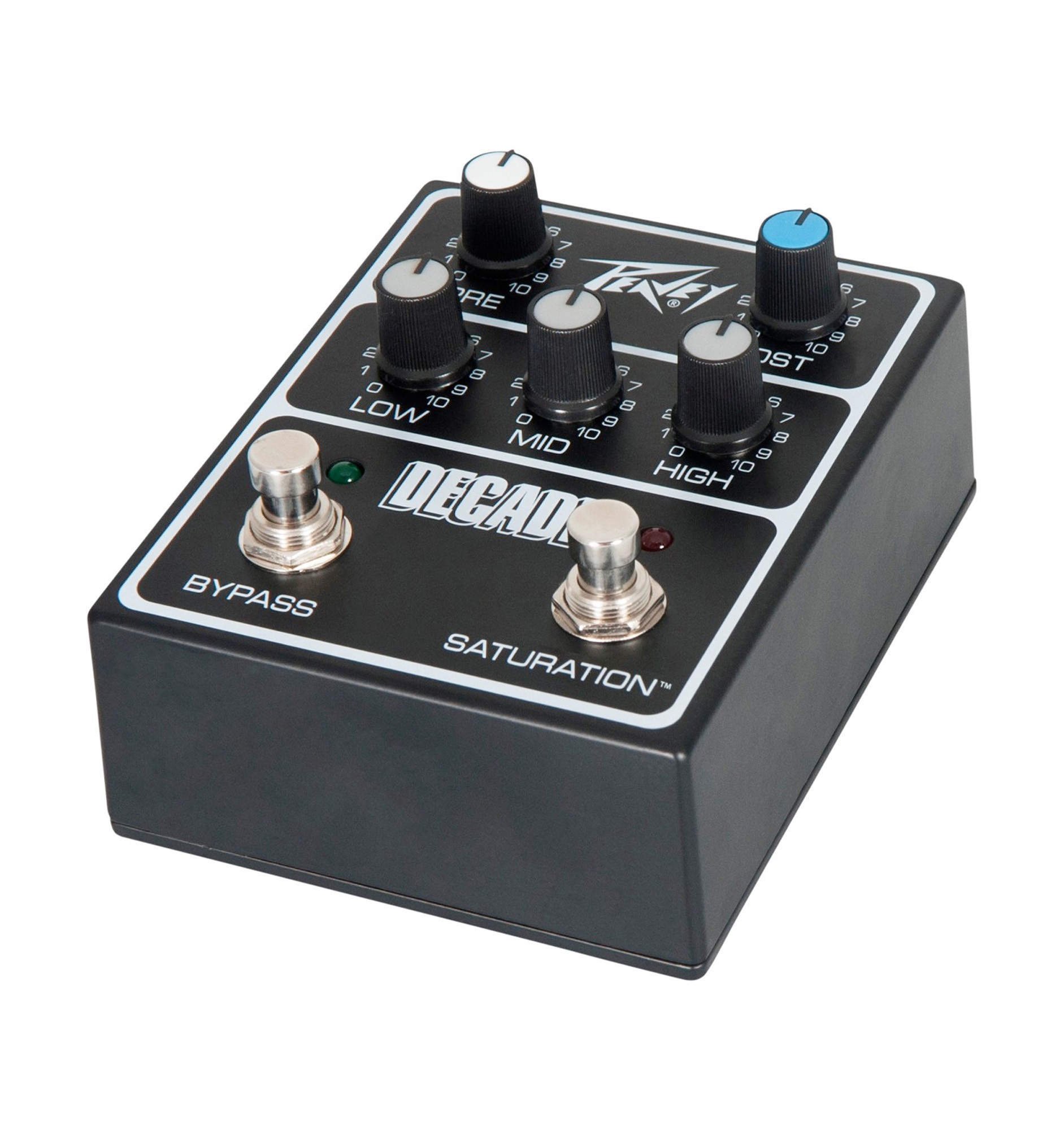 Pedal preamplificador Peavey Decade, diseñada para reproducir fielmente el circuito vintage del amplificador Peavey Decade original de los años 80. Integra un canal Saturation activable mediante un switch dedicado, controles independientes de Pre Gain y Post Gain, así como una ecualización de 3 bandas con ajustes Low, Mid y High. Su alimentación interna de 24V funciona a partir de un adaptador o de una pila estándar de 9V, y su bypass mecánico con circuito anti-pop garantiza una conmutación silenciosa. Consumo: 50 mA a 9V.