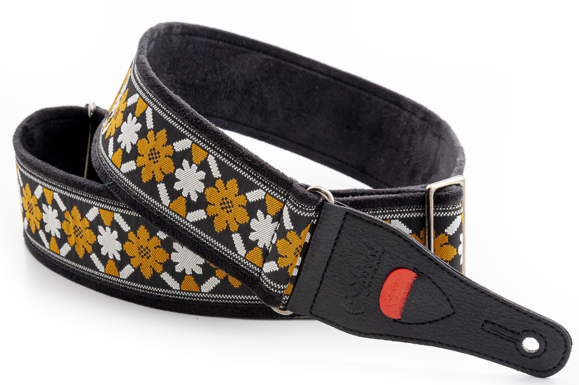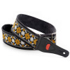 Esta correa combina un tejido Jacquard con un forro de microfibra, con extremos 100% sintéticos y un acolchado de alta densidad. Su ancho de 6 cm y su longitud ajustable de 85 a 150 cm permiten un uso adaptado según las necesidades, mientras que el porta púas integrado añade un aspecto práctico en el día a día.