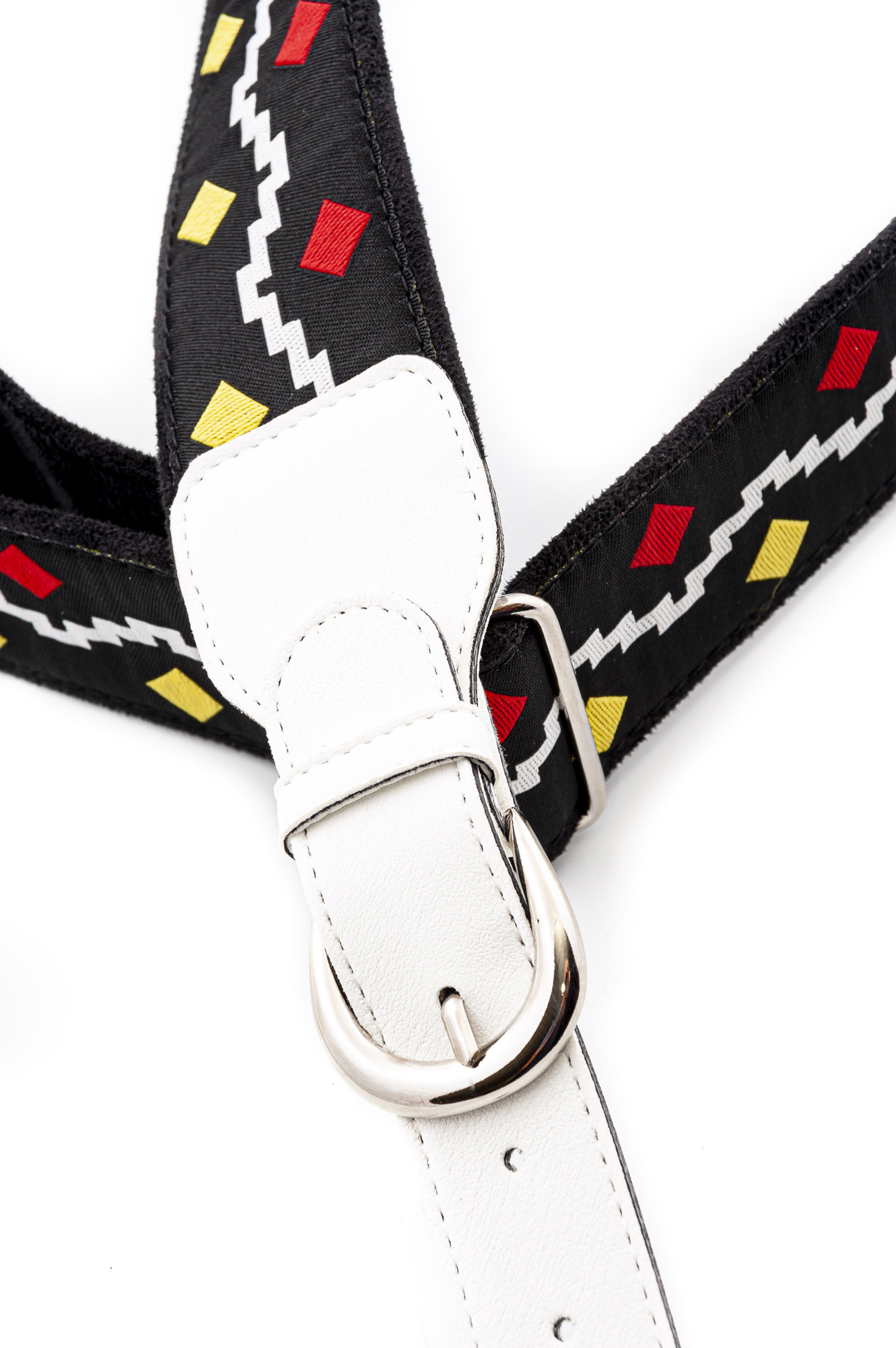 Se distingue por su anchura de 6 cm, su longitud ajustable de 85 a 150 cm, su combinación en negro y blanco y sus acabados que incluyen un acolchado de alta densidad y una hebilla plateada.