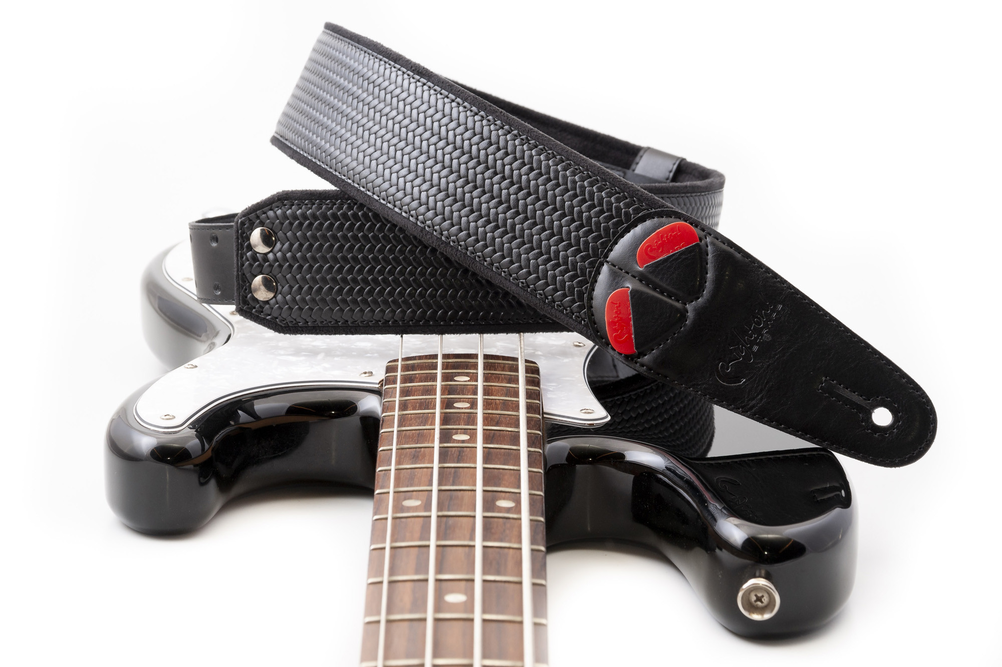 Este modelo está dirigido a las personas que buscan una correa ajustable, con porta púas integrado y una concepción sintética.
