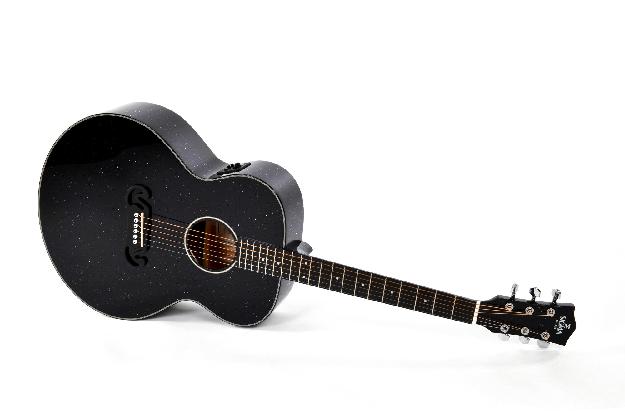 Este modelo Grand Jumbo ha sido diseñado para ofrecer una presencia sonora amplia y equilibrada, con una tapa de abeto Sitka macizo, fondo y aros de caoba, así como un mástil de caoba. Su diapasón de micarta, sus silletas de hueso y su escala de 25,4" (645 mm) contribuyen a un tacto preciso y cómodo. La electrónica Fishman Presys II con afinador integrado permite una amplificación fiable, mientras que las clavijas cromadas de engranajes cerrados aseguran una afinación estable. Su acabado negro con purpurina le da un aspecto distintivo.