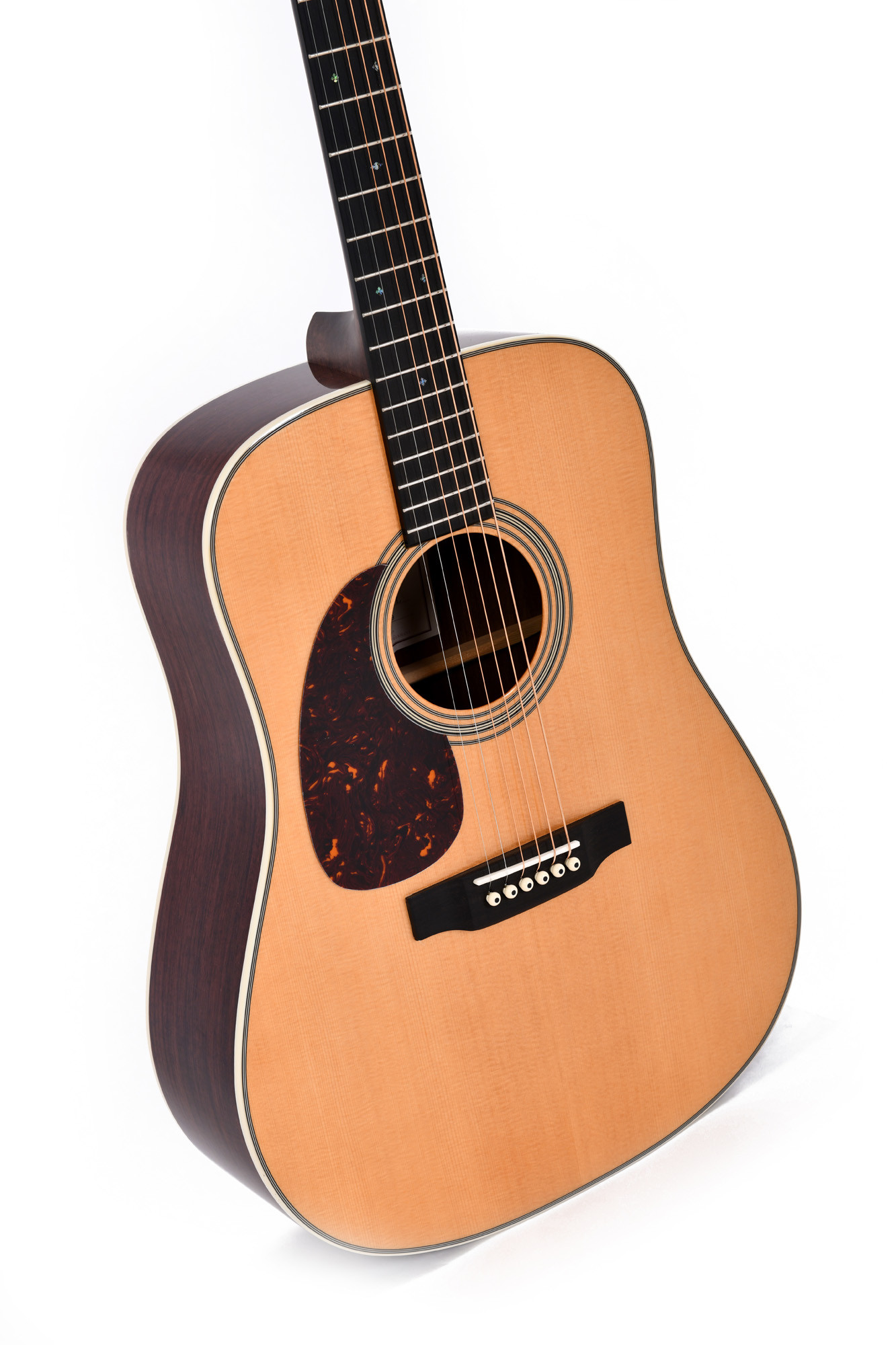 Su construcción en abeto Sitka macizo y palisandro indio macizo, junto con un diapasón y puente de ébano, cejuelas de hueso y clavijeros Grover cromados, pone de relieve materiales y componentes seleccionados por la calidad de su fabricación.