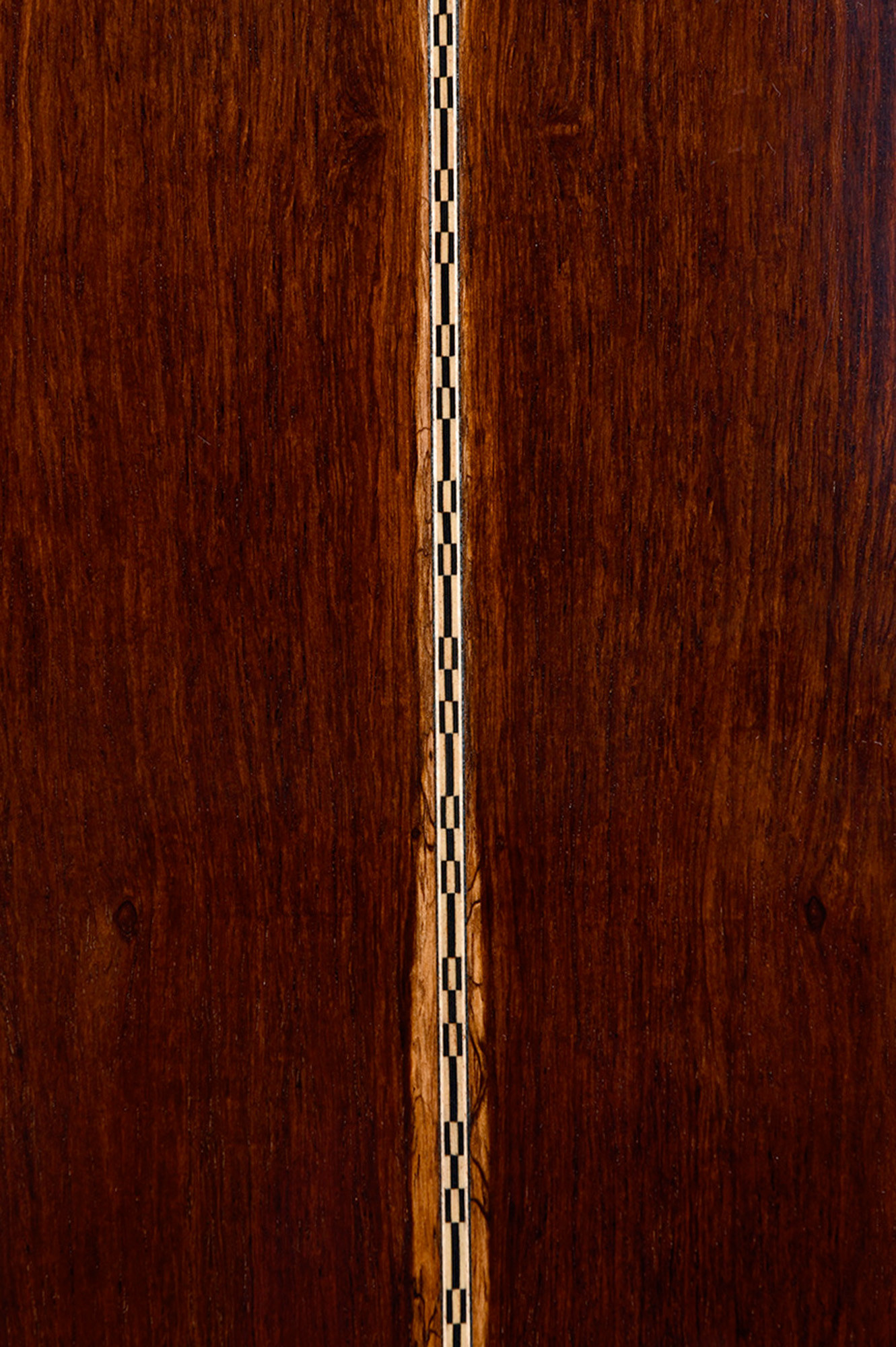 Se distingue por su tapa de abeto Sitka macizo tostado, su fondo y aros de palosanto de Madagascar macizo, sus cejuelas de hueso, así como su diapasón y puente de ébano.