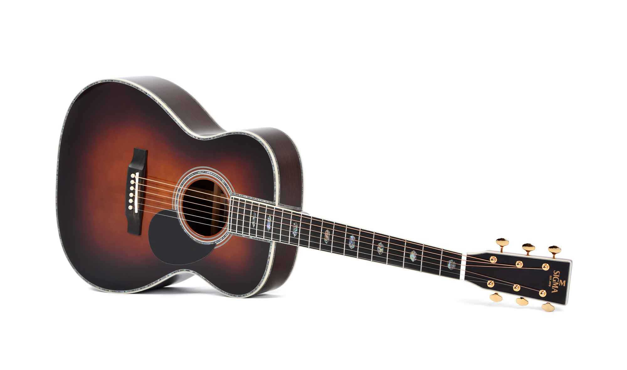 Este modelo Orchestra combina una tapa de abeto Sitka macizo con fondo y aros de palosanto indio macizo de calidad A para ofrecer una fabricación cuidada y coherente. El mástil de caoba, el diapasón y el puente de ébano, así como las cejuelas de hueso, completan un conjunto elegante y preciso. El acabado sunburst brillante, las incrustaciones nacaradas y las clavijeras abiertas Grover doradas aportan un toque estético refinado. Se incluye el estuche SSC-OM.