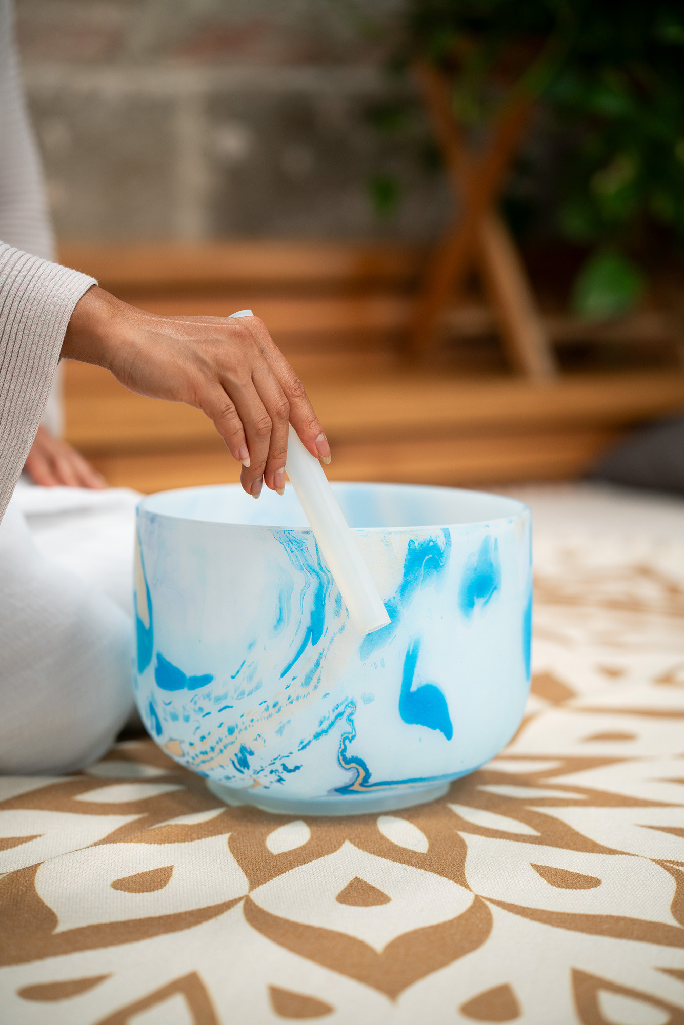 El cuenco tibetano de cristal veteado de 10 pulgadas de Meinl Sonic Energy está fabricado con cuarzo de altísima pureza. Está asociado al chakra de la garganta y afinado en 432 Hz, con una nota G4. Su color azul cielo le da una presentación armoniosa, mientras que el anillo de silicona blanco incluido contribuye a optimizar la resonancia y a limitar los impactos.