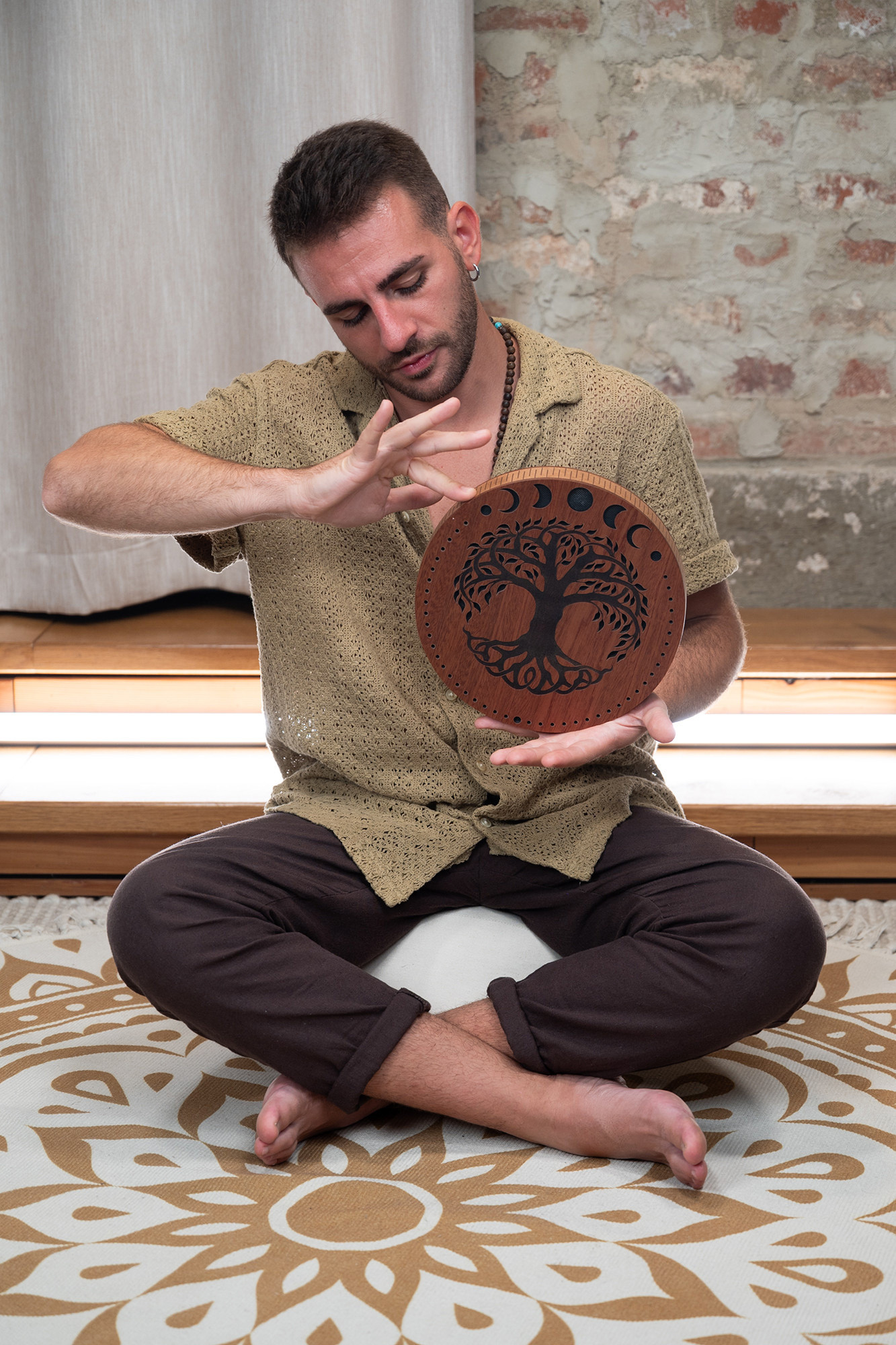 Este disco de 10" está fabricado en madera de sapeli y presenta una superficie tallada con motivos de fases lunares y árbol de la vida. Con su diámetro de 25,4 cm y su altura de 3,4 cm, produce sonidos relajantes similares a los de un arroyo. Se entrega con una bolsa blanda y un soporte de madera para un almacenamiento y una presentación prácticos.