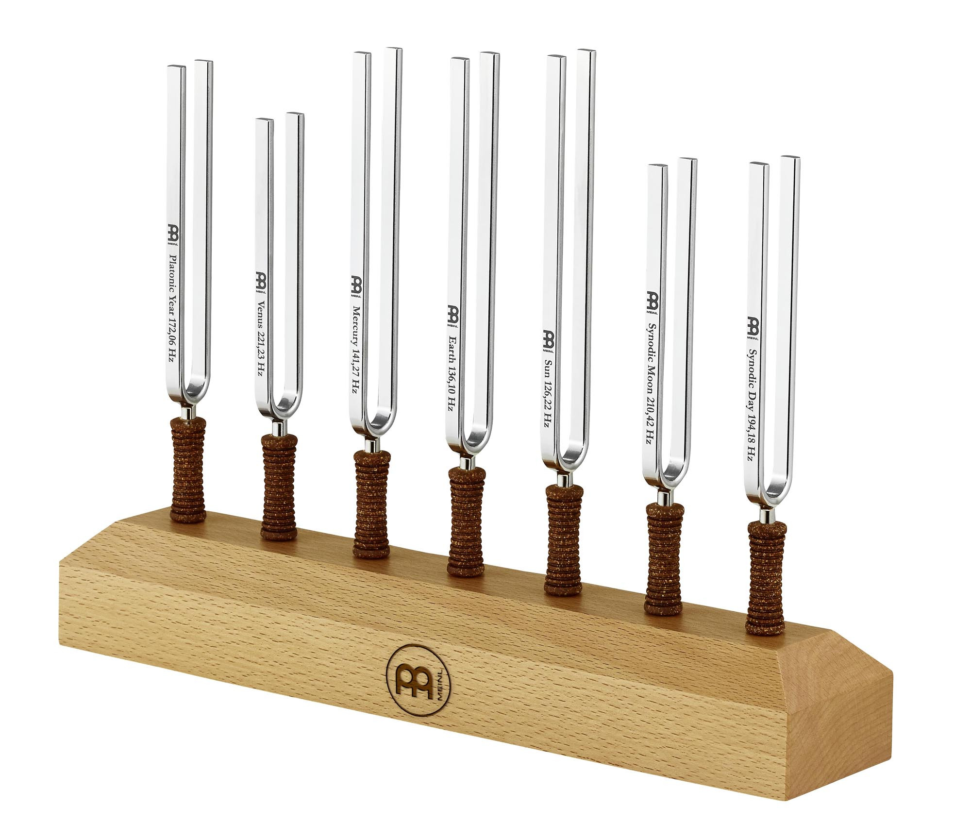 Juego de 7 diapasones afinados Planetary Tuned, fabricados artesanalmente en Alemania en acero inoxidable. Este set se entrega sin soporte y reúne siete frecuencias específicas: Platonic Year, Venus, Mercury, Earth, Sun, Synodic Moon y Synodic Day.