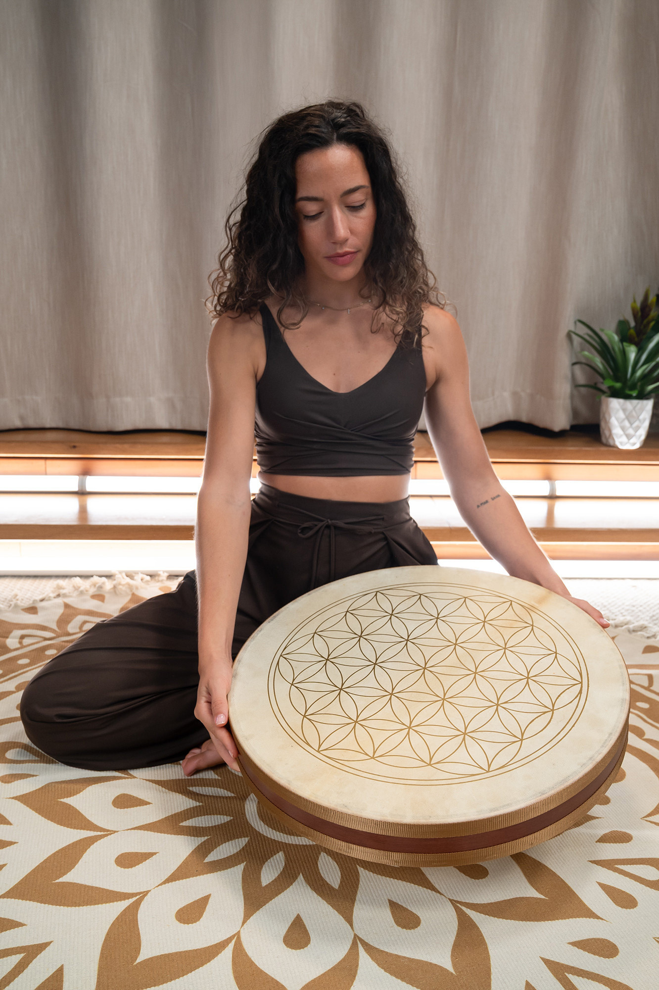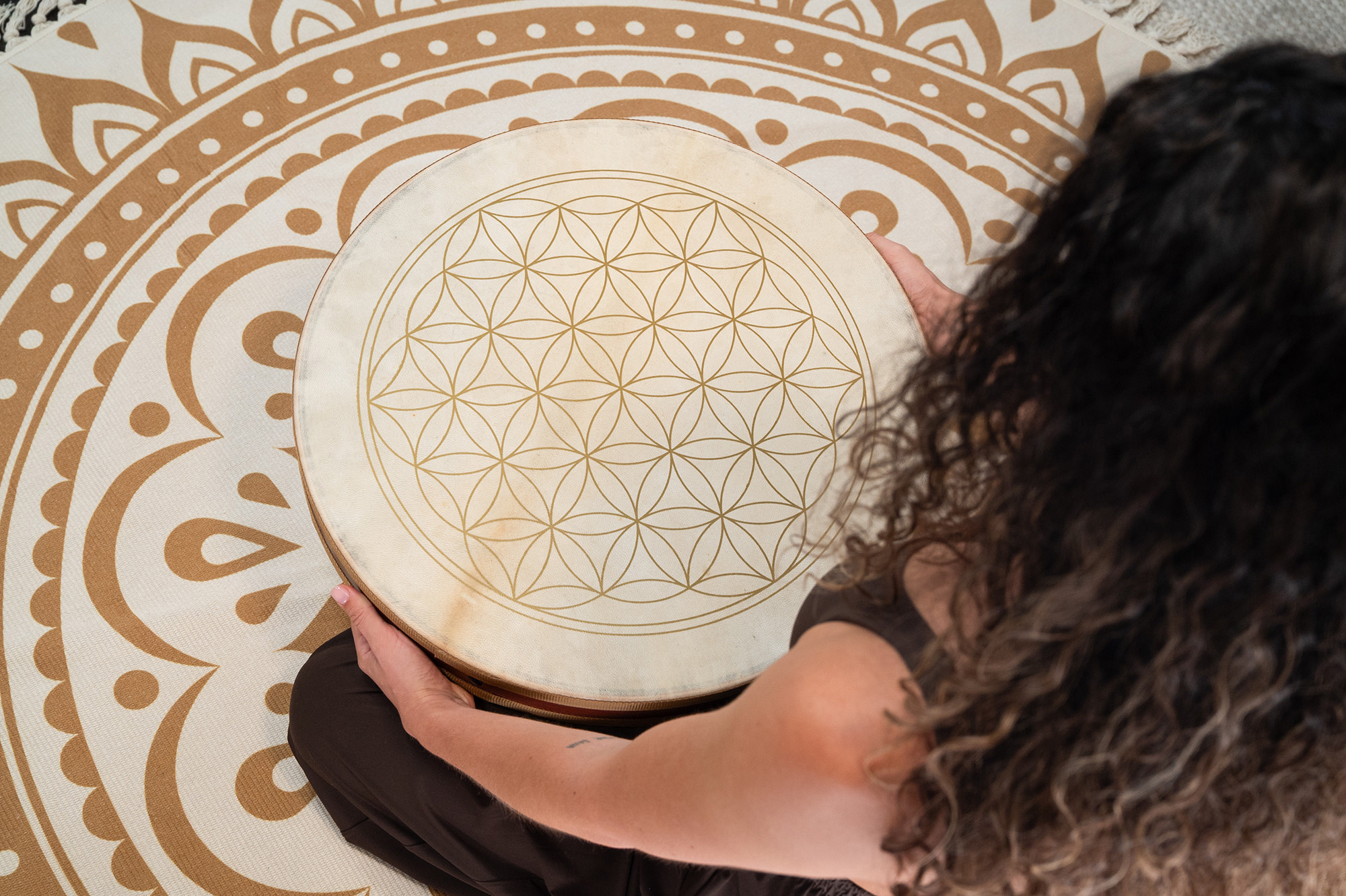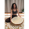 Destaca por su formato de 20", su motivo de flor de la vida y su relleno de cuentas de vidrio, que contribuyen a un sonido relajante y a una identidad visual marcada.