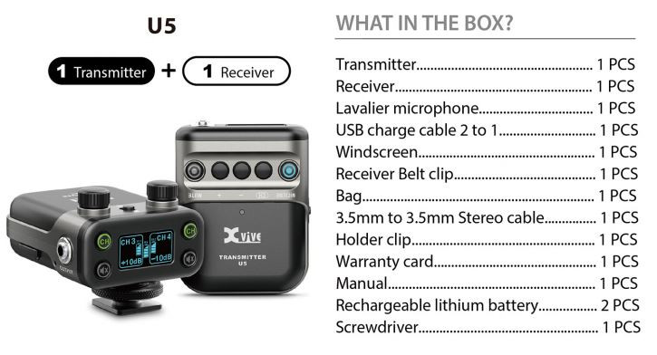 El sistema HF Xvive U5 está diseñado para vídeo y entrevistas, con transmisión digital sin comprimir en 2,4 GHz. Incluye un transmisor, un receptor, un micrófono lavalier LV1, así como dos baterías recargables extraíbles. Su formato práctico permite un uso sencillo con cámara, micrófono lavalier o una fuente de nivel de línea a través de jack de 3,5 mm.