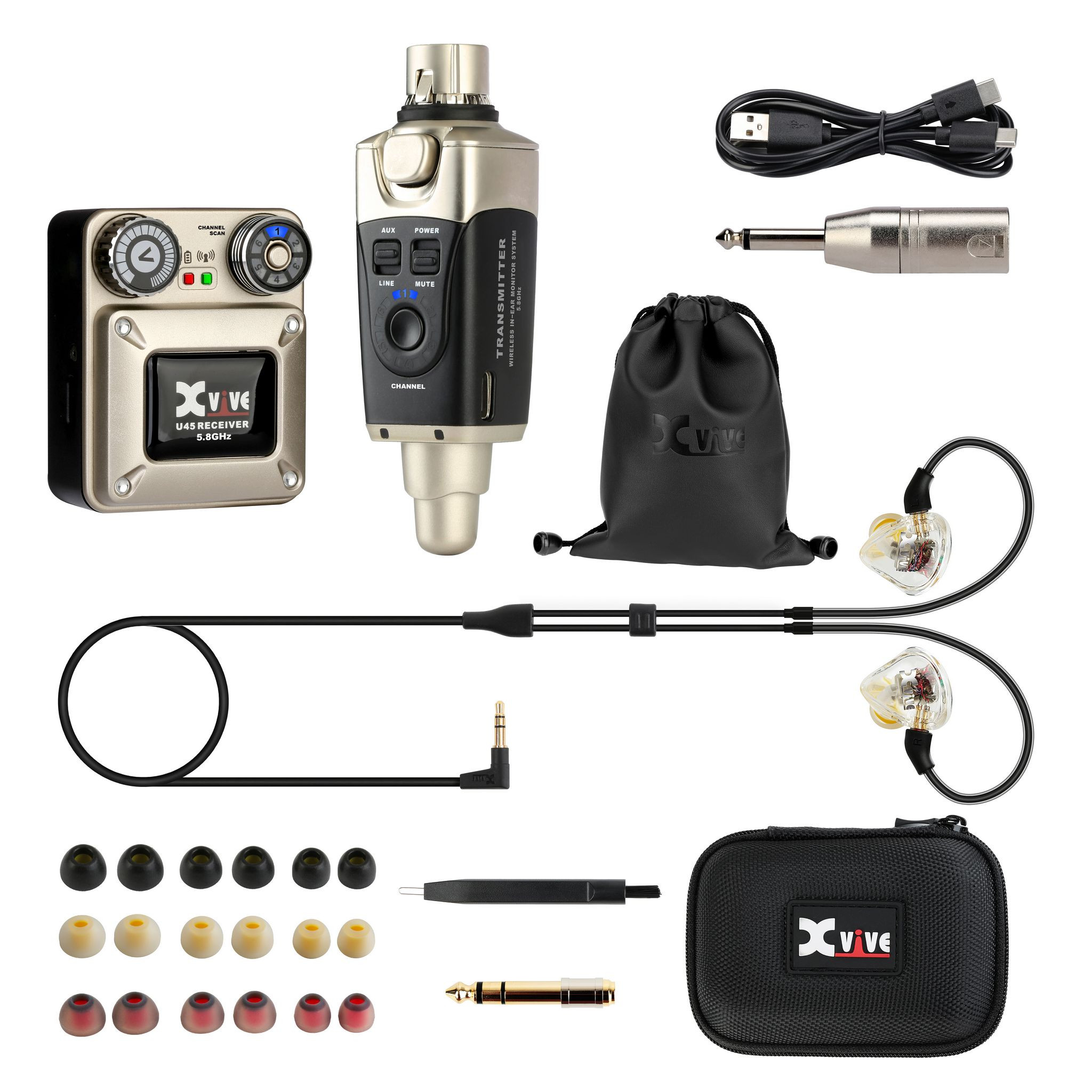 El Xvive U45t9 es un conjunto completo para monitorización in-ear inalámbrica, compuesto por el sistema inalámbrico U45 y los auriculares intrauditivos T9. Está diseñado para ofrecer una escucha fiable, precisa y cómoda en el escenario o en los ensayos.
