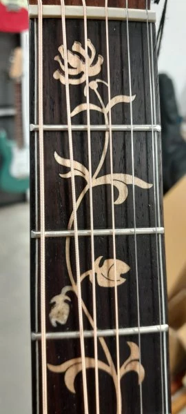 - Diapasón: palisandro, con incrustaciones en forma de árbol de la vida