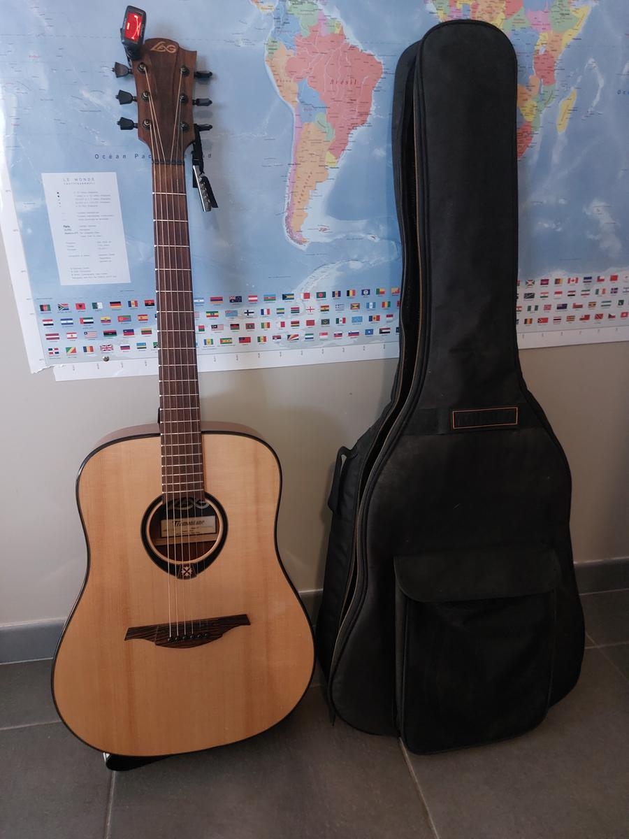 Guitarra Lag 80D con funda y accesorios: afinador, capo, púas.
