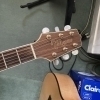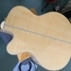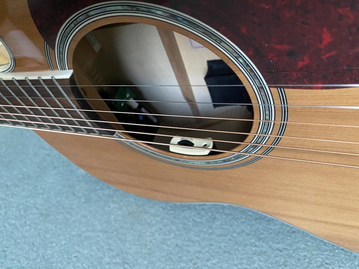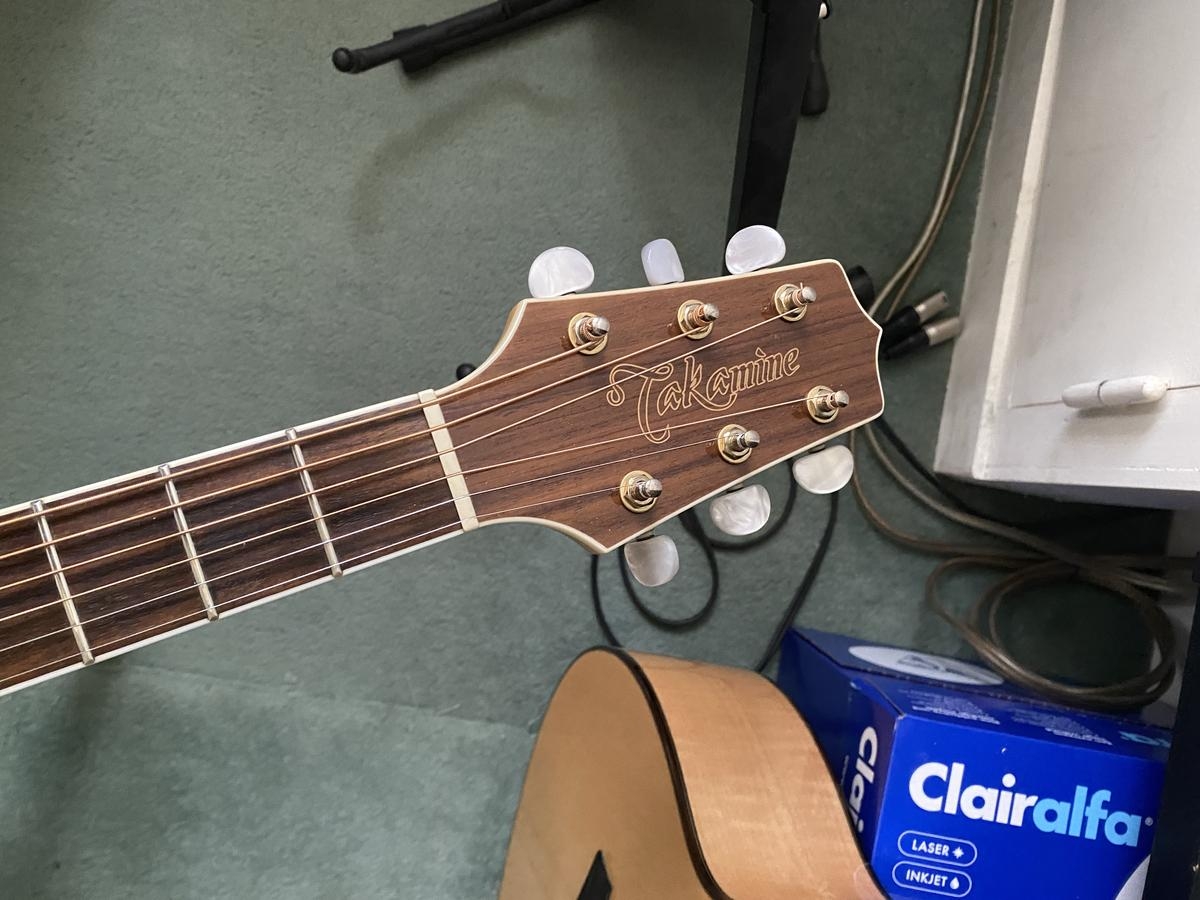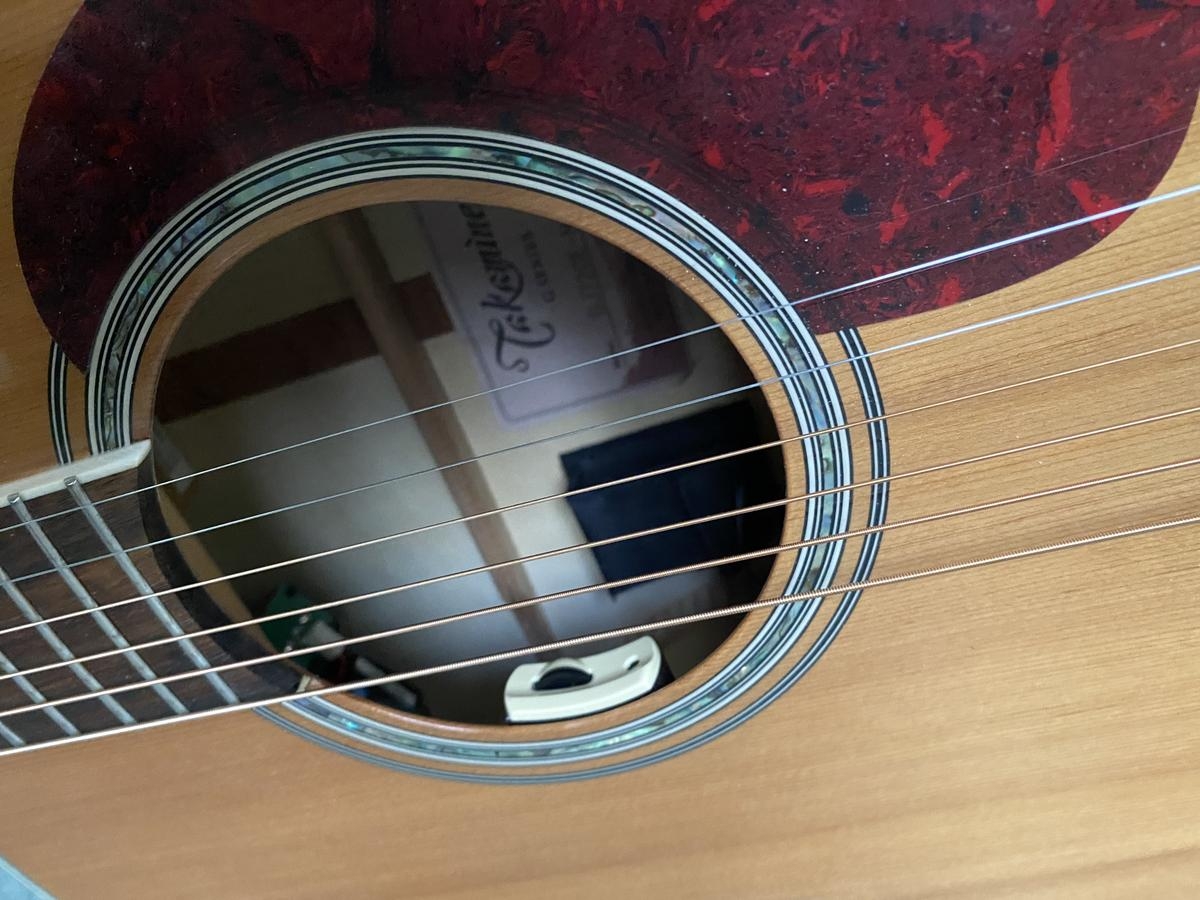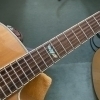 Guitarra electroacústica, marca TAKAMINE GJ72CE-NAT, tapa de abeto macizo, refuerzo en X, fondo y aros de arce flameado, mástil de arce, diapasón de laurel, rosetón de abulón, herrajes dorados, color natural