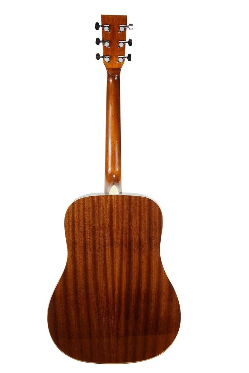 La opción de acabado Sunburst confiere a esta guitarra una estética elegante y clásica. El diapasón y el puente de palisandro, materiales conocidos por sus cualidades acústicas, contribuyen a una mejor transmisión de las vibraciones. El mástil de caoba garantiza comodidad y estabilidad durante el juego. Las clavijas cromadas con baño de aceite aseguran una afinación precisa y duradera. La guitarra está equipada con un filete de línea doble negro/blanco que resalta su aspecto sofisticado.