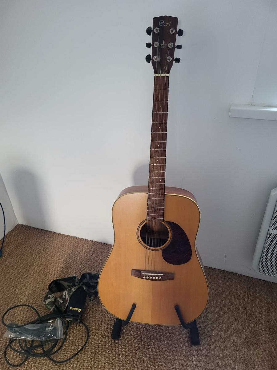 Guitarra electroacústica Cort muy poco usada con funda de transporte, correa Ibanez y soporte.